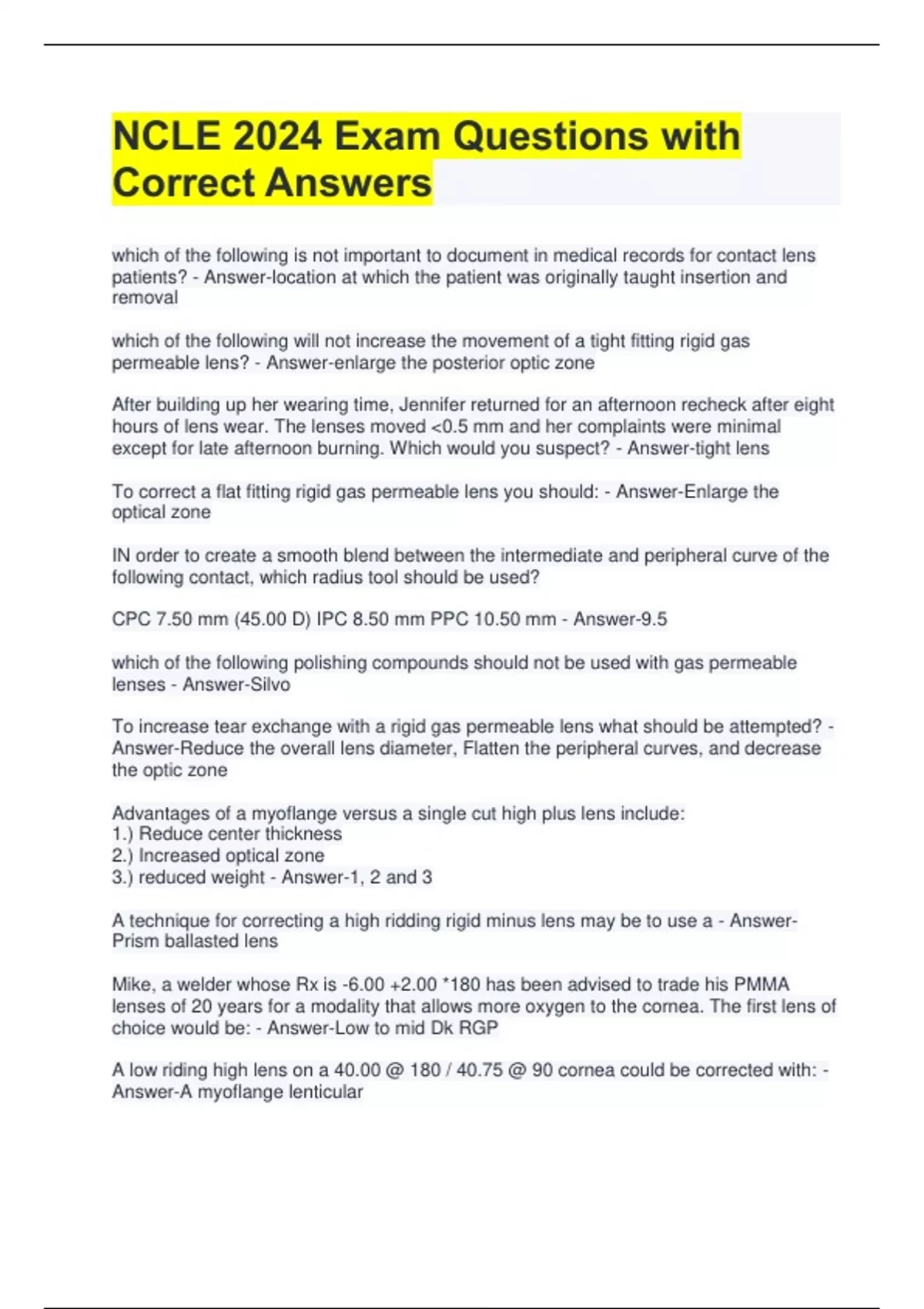 NCLE 2024 Exam Questions with Correct Answers which of the following is not important to document in medical records for contact lens patients? - Answer-location at which the patient was originally taught insertion and removal which of the following will not increase the movement of a tight fitting rigid gas permeable lens? - Answer-enlarge the posterior optic zone After building up her wearing time, Jennifer returned for an afternoon recheck after eight hours of lens wear. The lenses moved <0.5 mm and her complaints were minimal except for late afternoon burning. Which would you suspect? - Answer-tight lens To correct a flat fitting rigid gas permeable lens you should: - Answer-Enlarge the optical zone IN order to create a smooth blend between the intermediate and peripheral curve of the following contact, which radius tool should be used? CPC 7.50 mm (45.00 D) IPC 8.50 mm PPC 10.50 mm - Answer-9.5 which of the following polishing compounds should not be used with gas permeable lenses - Answer-Silvo To increase tear exchange with a rigid gas permeable lens what should be attempted? - Answer-Reduce the overall lens diameter, Flatten the peripheral curves, and decrease the optic zone Advantages of a myoflange versus a single cut high plus lens include: 1.) Reduce center thickness 2.) Increased optical zone 3.) reduced weight - Answer-1, 2 and 3 A technique for correcting a high ridding rigid minus lens may be to use a - AnswerPrism ballasted lens Mike, a welder whose Rx is -6.00 +2.00 *180 has been advised to trade his PMMA lenses of 20 years for a modality that allows more oxygen to the cornea. The first lens of choice would be: - Answer-Low to mid Dk RGP A low riding high lens on a 40.00 @ 180 / 40.75 @ 90 cornea could be corrected with: - Answer-A myoflange lenticular Rigid gas permeable lens flexure may be eliminated by: - Answer-reducing sagittal vaulting, increasing center thickness, choosing a lower Dk material What two design changes might be helpful in centering a high riding myopic lens? 1.) Flattening the base curve 2.) myoflange lenticular 3.) Hyperflange lenticular 4.) Prism ballast - Answer-3 and 4; hyperflange lenticular and prism ballast on a compromised cornea, such as a one that has undergone a corneal graft, what lens characteristics would be most beneficial? - Answer-high Dk/L lenses that allow more oxygen to the cornia K's 42.00 @ 170 / 43.00 @ 80 Rx -3.00 -1.00 x 170 Given the above Rx and K's, the following diagnostic toric soft lens was used: 8.8 -3.00 -1.00 x 180 During the diagnostic evalution, the above lens rotated 10 degrees clockwise. The lens ordered should have an axis of 180 degrees Once the correctly ordered lens has been dispensed, the rotational marks should settle at: - Answer-10 degrees clockwise When there is slight pooling of fluorescein in the peripheral curve portion of a rigid lens, it indicates: - Answer-slight edge lift a rigid lens showing a band-shaped area of touch on the flattest meridian is an indication of: - Answer-An astigmatic fit a rigid lens showing central vaulting is indicative of: - Answer-Apical clearance fit contact lenses that have a non-spherical back surface are called: - Answer-Aspheric lenses