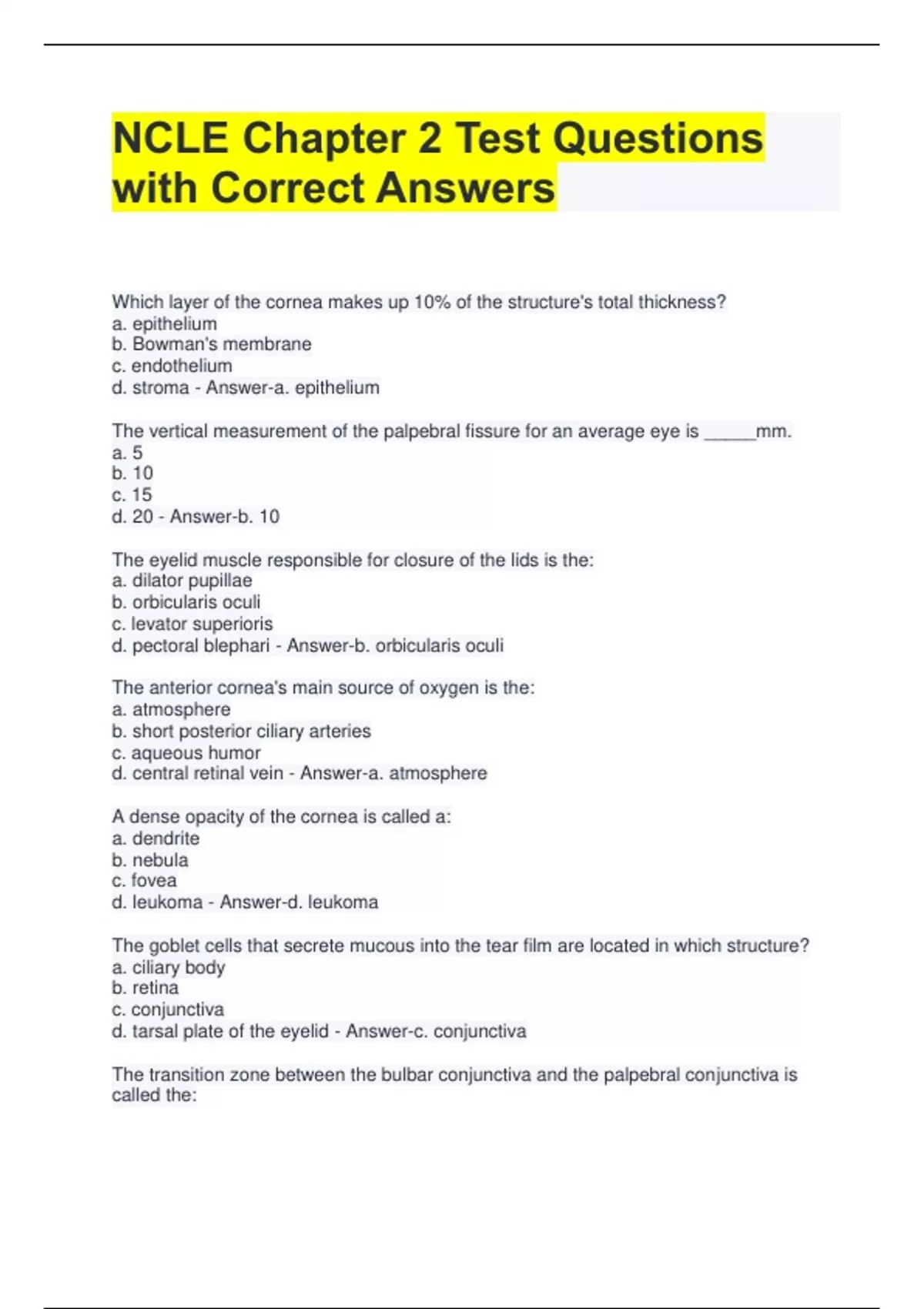 NCLE Chapter 2 Test Questions with Correct Answers Which layer of the cornea makes up 10% of the structure's total thickness? a. epithelium b. Bowman's membrane c. endothelium d. stroma - Answer-a. epithelium The vertical measurement of the palpebral fissure for an average eye is _____mm. a. 5 b. 10 c. 15 d. 20 - Answer-b. 10 The eyelid muscle responsible for closure of the lids is the: a. dilator pupillae b. orbicularis oculi c. levator superioris d. pectoral blephari - Answer-b. orbicularis oculi The anterior cornea's main source of oxygen is the: a. atmosphere b. short posterior ciliary arteries c. aqueous humor d. central retinal vein - Answer-a. atmosphere A dense opacity of the cornea is called a: a. dendrite b. nebula c. fovea d. leukoma - Answer-d. leukoma The goblet cells that secrete mucous into the tear film are located in which structure? a. ciliary body b. retina c. conjunctiva d. tarsal plate of the eyelid - Answer-c. conjunctiva The transition zone between the bulbar conjunctiva and the palpebral conjunctiva is called the: a. fundus b. blend c. limbus d. fornix - Answer-d. fornix The middle layer of the three main layers of the globe is mostly responsible for: a. nutrition b. light sensitivity c. protection d. ocular motility - Answer-a. nutrition Pupillary constriction is called: a. cycloplegia b. esophoria c. miosis d. mydriasis - Answer-c. miosis