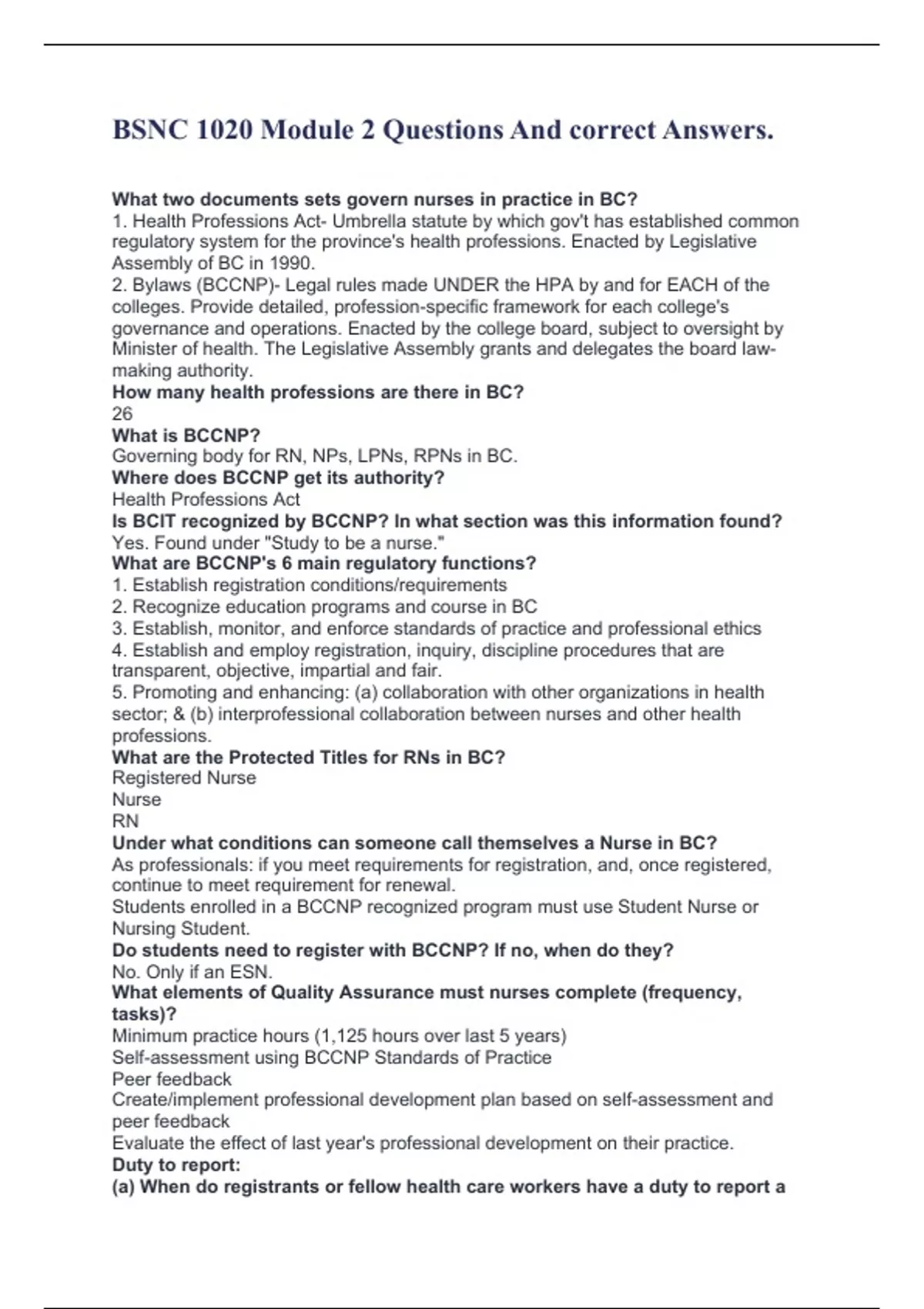 BSNC 1020 Module 2 Questions And correct Answers. What two documents sets govern nurses in practice in BC? 1. Health Professions Act- Umbrella statute by which gov't has established common regulatory system for the province's health professions. Enacted by Legislative Assembly of BC in 1990. 2. Bylaws (BCCNP)- Legal rules made UNDER the HPA by and for EACH of the colleges. Provide detailed, profession-specific framework for each college's governance and operations. Enacted by the college board, subject to oversight by Minister of health. The Legislative Assembly grants and delegates the board law-making authority. How many health professions are there in BC? 26 What is BCCNP? Governing body for RN, NPs, LPNs, RPNs in BC. Where does BCCNP get its authority? Health Professions Act Is BCIT recognized by BCCNP? In what section was this information found? Yes. Found under "Study to be a nurse." What are BCCNP's 6 main regulatory functions? 1. Establish registration conditions/requirements 2. Recognize education programs and course in BC 3. Establish, monitor, and enforce standards of practice and professional ethics 4. Establish and employ registration, inquiry, discipline procedures that are transparent, objective, impartial and fair. 5. Promoting and enhancing: (a) collaboration with other organizations in health sector; & (b) interprofessional collaboration between nurses and other health professions. What are the Protected Titles for RNs in BC? Registered Nurse Nurse RN Under what conditions can someone call themselves a Nurse in BC? As professionals: if you meet requirements for registration, and, once registered, continue to meet requirement for renewal. Students enrolled in a BCCNP recognized program must use Student Nurse or Nursing Student. Do students need to register with BCCNP? If no, when do they? No. Only if an ESN. What elements of Quality Assurance must nurses complete (frequency, tasks)? Minimum practice hours (1,125 hours over last 5 years) Self-assessment using BCCNP Standards of Practice Peer feedback Create/implement professional development plan based on self-assessment and peer feedback Evaluate the effect of last year's professional development on their practice. Duty to report: (a) When do registrants or fellow health care workers have a duty to report a
