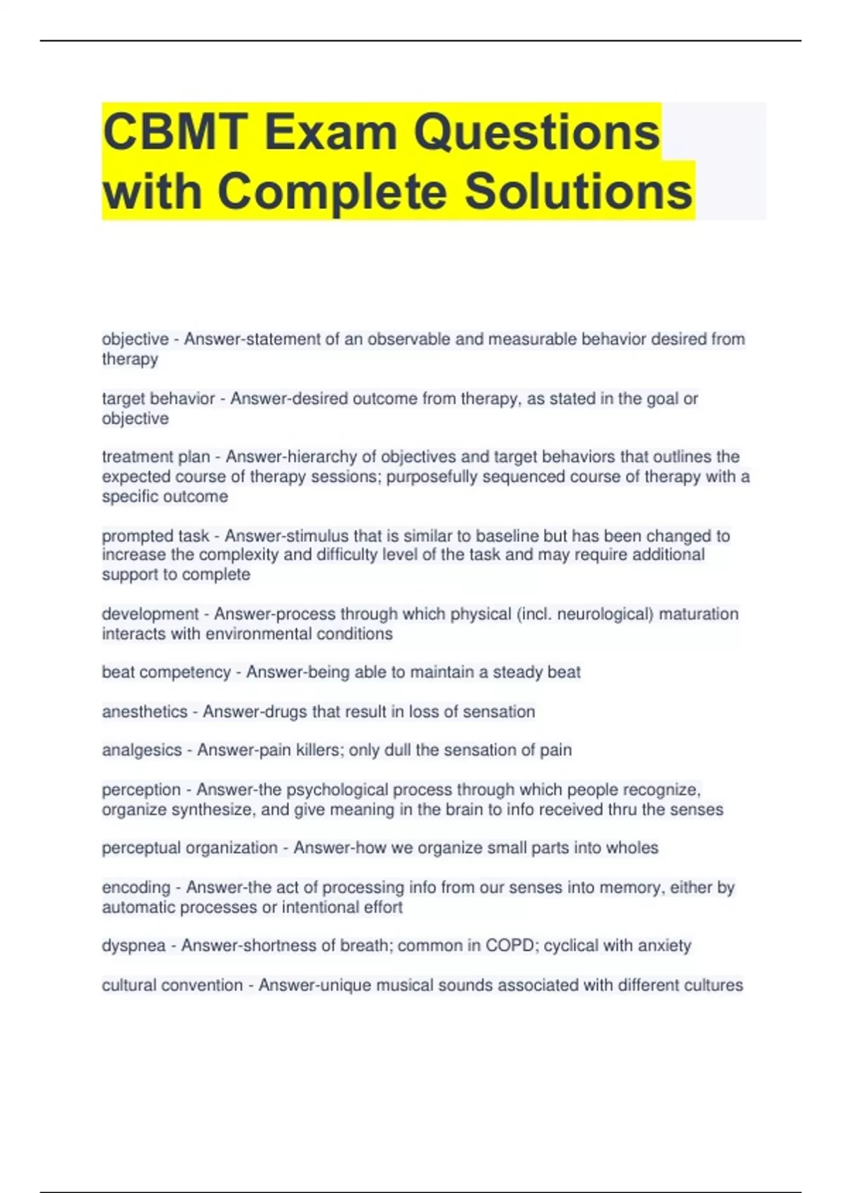bjective - Answer-statement of an observable and measurable behavior desired from therapy target behavior - Answer-desired outcome from therapy, as stated in the goal or objective treatment plan - Answer-hierarchy of objectives and target behaviors that outlines the expected course of therapy sessions; purposefully sequenced course of therapy with a specific outcome prompted task - Answer-stimulus that is similar to baseline but has been changed to increase the complexity and difficulty level of the task and may require additional support to complete development - Answer-process through which physical (incl. neurological) maturation interacts with environmental conditions beat competency - Answer-being able to maintain a steady beat anesthetics - Answer-drugs that result in loss of sensation analgesics - Answer-pain killers; only dull the sensation of pain perception - Answer-the psychological process through which people recognize, organize synthesize, and give meaning in the brain to info received thru the senses perceptual organization - Answer-how we organize small parts into wholes encoding - Answer-the act of processing info from our senses into memory, either by automatic processes or intentional effort dyspnea - Answer-shortness of breath; common in COPD; cyclical with anxiety cultural convention - Answer-unique musical sounds associated with different cultures referentialist theory - Answer-the belief that the meaning in music arises from the connections the listener makes between the music itself and some nonmusical object or event optimal complexity theory - Answer-we feel pleasurable feelings if the structural features of the music are at an optimal or ideal level of complexity and/or familiarity theory of expectations - Answer-people have an emotional response to music when the musical sounds they expect to hear do not actually occur geriatrics - Answer-medical subspecialty concerned with the care of elderly patients and treatment of their medical problems gerontology - Answer-study of the elderly population senesence - Answer-universal and inevitable decline in the efficiency of body systems psychological age - Answer-how well a person responds to a changing environment and how well they can adapt to new situations/experiences psychosocial age - Answer-how well a person is doing "for their age" based on societal/cultural norms and expectations sensorimotor - Answer-both motor and auditory/sensory pathway