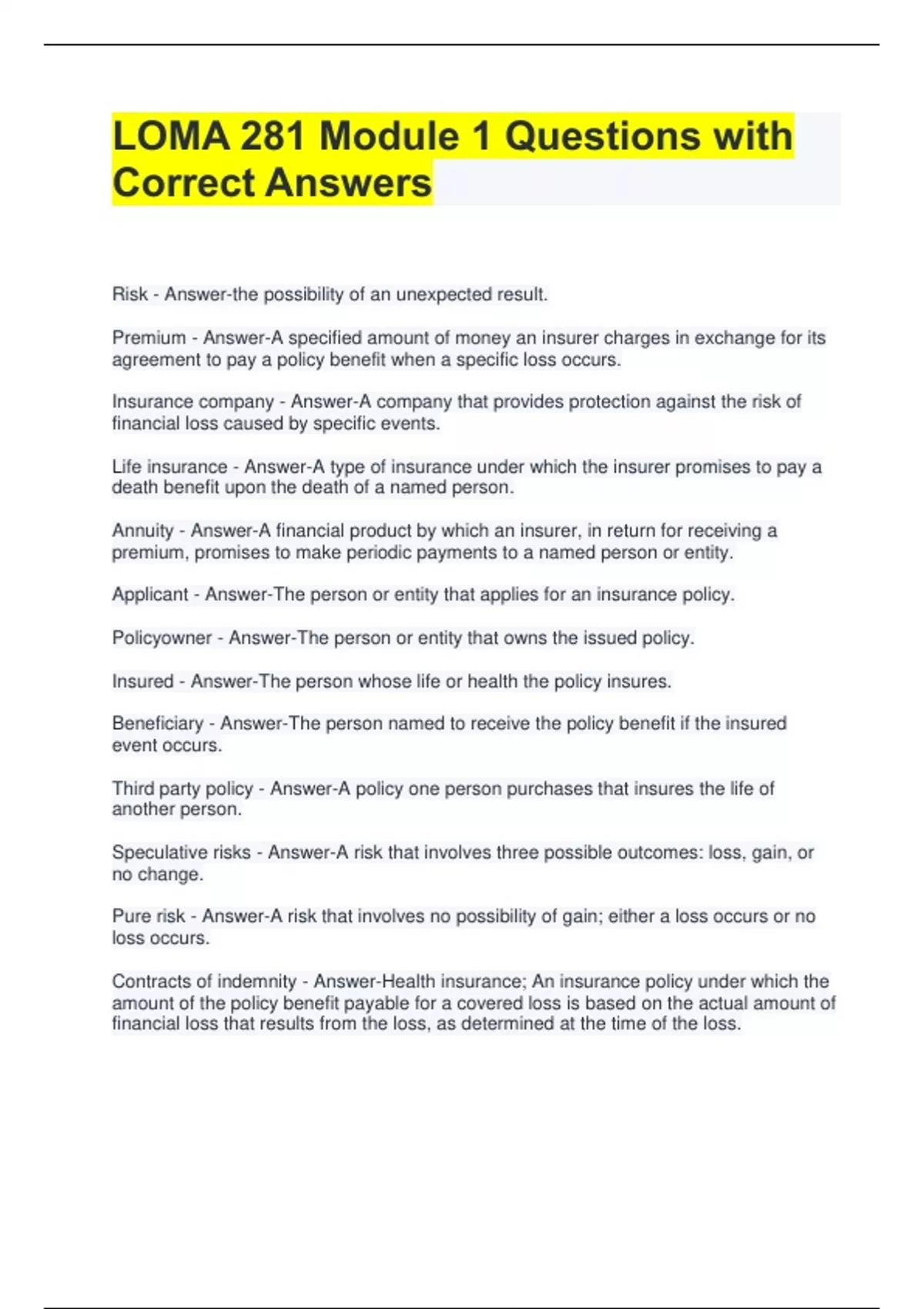 LOMA 281 Module 1 Questions with Correct Answers Risk - Answer-the possibility of an unexpected result. Premium - Answer-A specified amount of money an insurer charges in exchange for its agreement to pay a policy benefit when a specific loss occurs. Insurance company - Answer-A company that provides protection against the risk of financial loss caused by specific events. Life insurance - Answer-A type of insurance under which the insurer promises to pay a death benefit upon the death of a named person. Annuity - Answer-A financial product by which an insurer, in return for receiving a premium, promises to make periodic payments to a named person or entity. Applicant - Answer-The person or entity that applies for an insurance policy. Policyowner - Answer-The person or entity that owns the issued policy. Insured - Answer-The person whose life or health the policy insures. Beneficiary - Answer-The person named to receive the policy benefit if the insured event occurs. Third party policy - Answer-A policy one person purchases that insures the life of another person. Speculative risks - Answer-A risk that involves three possible outcomes: loss, gain, or no change. Pure risk - Answer-A risk that involves no possibility of gain; either a loss occurs or no loss occurs. Contracts of indemnity - Answer-Health insurance; An insurance policy under which the amount of the policy benefit payable for a covered loss is based on the actual amount of financial loss that results from the loss, as determined at the time of the loss. Valued contract - Answer-Life insurance; An insurance policy that specifies the amount of the policy benefit that will be payable when a covered loss occurs, regardless of the actual amount of the loss the was incurred.