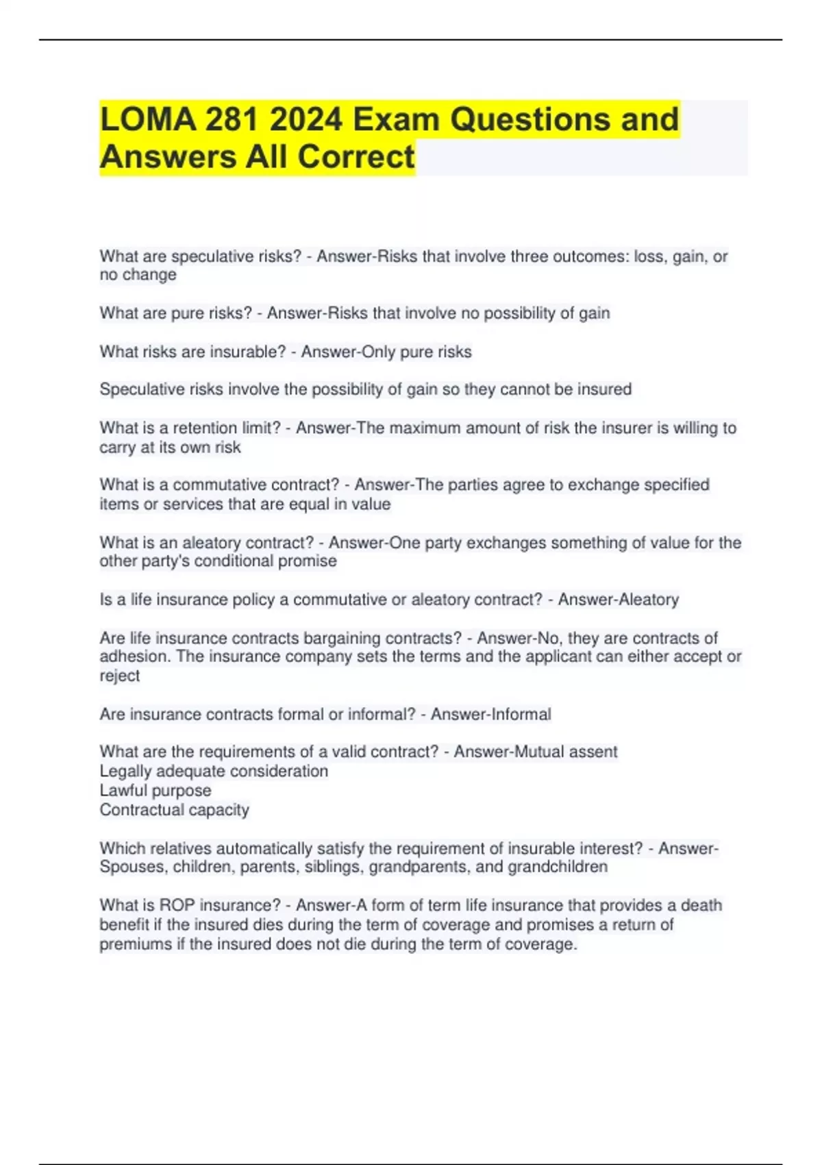 LOMA 281 2024 Exam Questions and Answers All Correct What are speculative risks? - Answer-Risks that involve three outcomes: loss, gain, or no change What are pure risks? - Answer-Risks that involve no possibility of gain What risks are insurable? - Answer-Only pure risks Speculative risks involve the possibility of gain so they cannot be insured What is a retention limit? - Answer-The maximum amount of risk the insurer is willing to carry at its own risk What is a commutative contract? - Answer-The parties agree to exchange specified items or services that are equal in value What is an aleatory contract? - Answer-One party exchanges something of value for the other party's conditional promise Is a life insurance policy a commutative or aleatory contract? - Answer-Aleatory Are life insurance contracts bargaining contracts? - Answer-No, they are contracts of adhesion. The insurance company sets the terms and the applicant can either accept or reject Are insurance contracts formal or informal? - Answer-Informal What are the requirements of a valid contract? - Answer-Mutual assent Legally adequate consideration Lawful purpose Contractual capacity Which relatives automatically satisfy the requirement of insurable interest? - AnswerSpouses, children, parents, siblings, grandparents, and grandchildren What is ROP insurance? - Answer-A form of term life insurance that provides a death benefit if the insured dies during the term of coverage and promises a return of premiums if the insured does not die during the term of coverage.