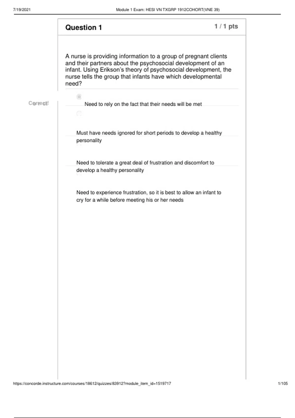 A nurse is providing information to a group of pregnant clients and their partners about the psychosocial development of an infant. Using Erikson’s theory of psychosocial development, the nurse tells the group that infants have which developmental need? Correct! Need to rely on the fact that their needs will be met Must have needs ignored for short periods to develop a healthy personality
