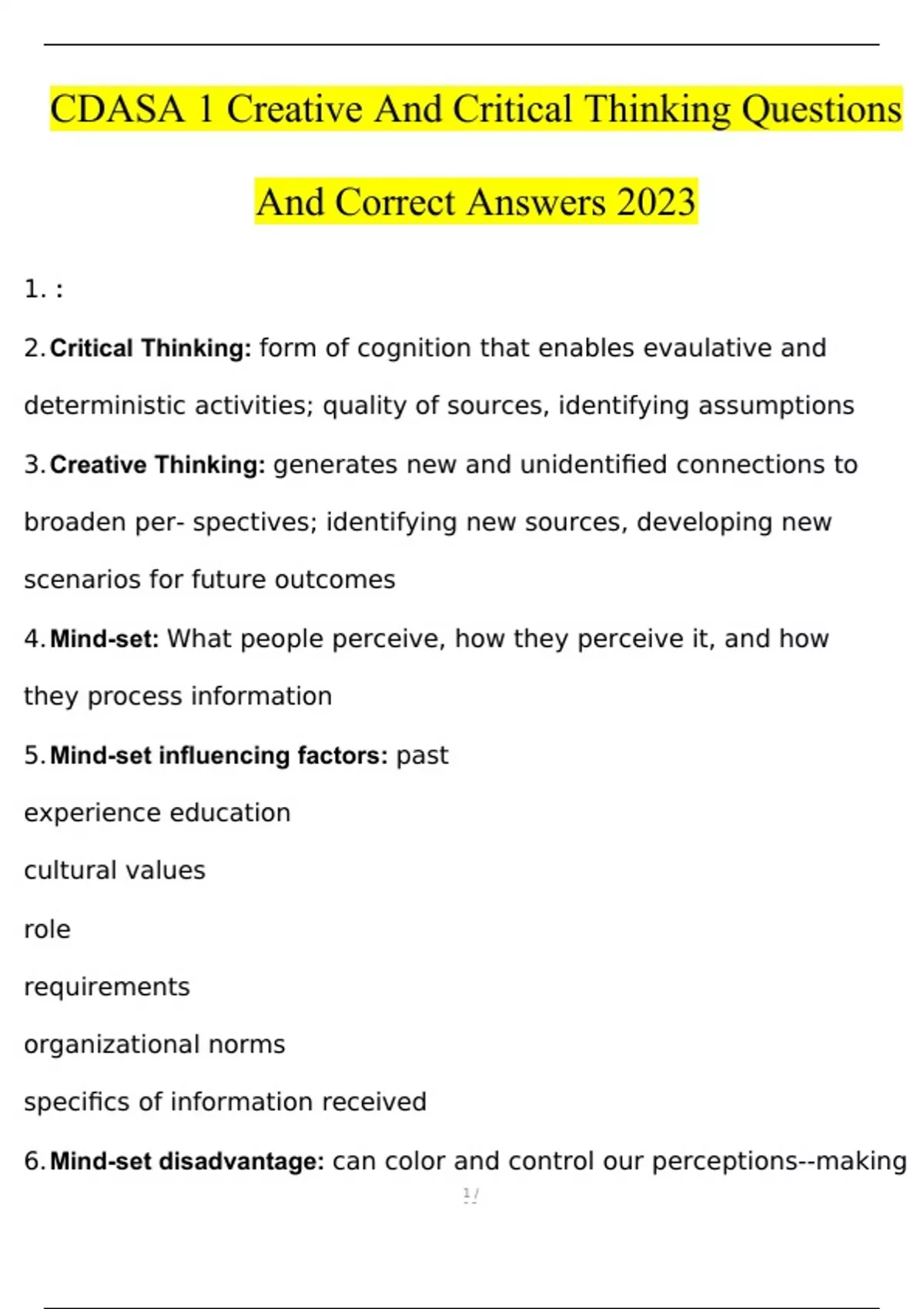 CDASA 1 Creative And Critical Thinking Questions and Correct Answers 2024/2025