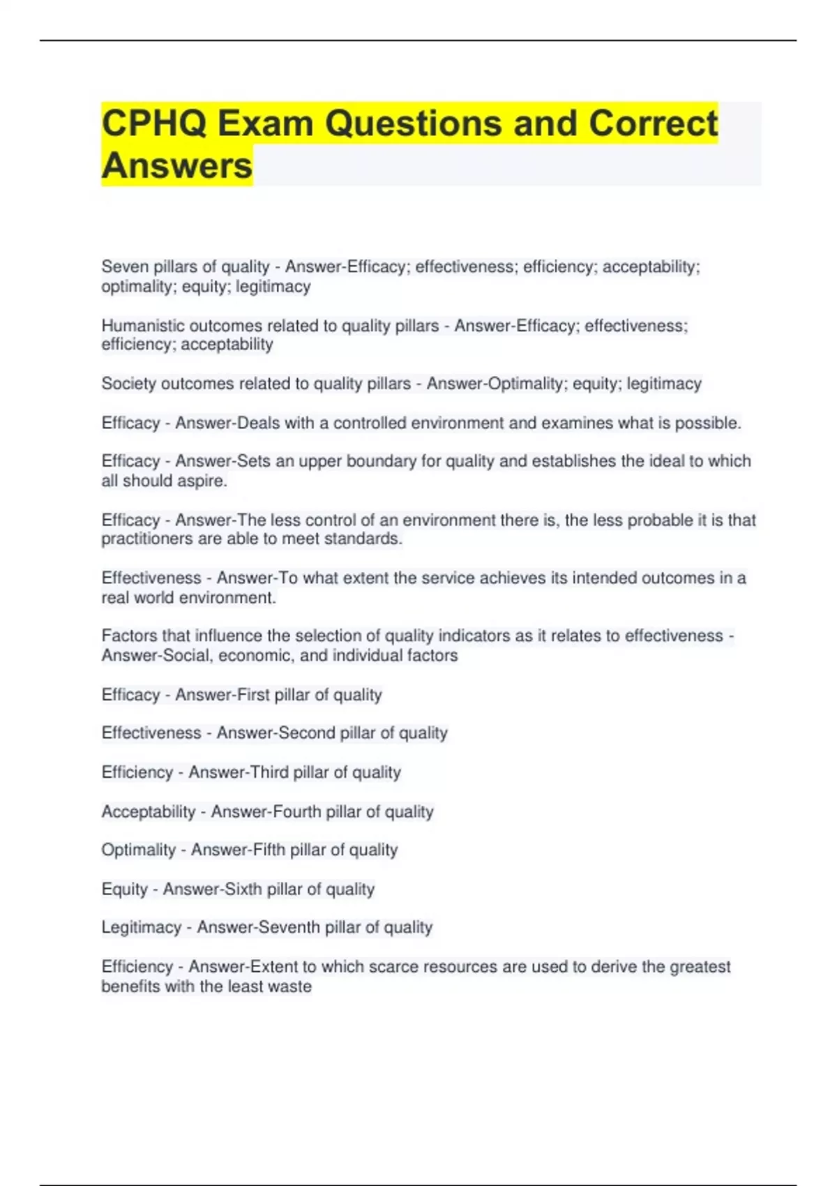 CPHQ Exam Questions and Correct Answers Seven pillars of quality - Answer-Efficacy; effectiveness; efficiency; acceptability; optimality; equity; legitimacy Humanistic outcomes related to quality pillars - Answer-Efficacy; effectiveness; efficiency; acceptability Society outcomes related to quality pillars - Answer-Optimality; equity; legitimacy Efficacy - Answer-Deals with a controlled environment and examines what is possible. Efficacy - Answer-Sets an upper boundary for quality and establishes the ideal to which all should aspire. Efficacy - Answer-The less control of an environment there is, the less probable it is that practitioners are able to meet standards. Effectiveness - Answer-To what extent the service achieves its intended outcomes in a real world environment. Factors that influence the selection of quality indicators as it relates to effectiveness - Answer-Social, economic, and individual factors Efficacy - Answer-First pillar of quality Effectiveness - Answer-Second pillar of quality Efficiency - Answer-Third pillar of quality Acceptability - Answer-Fourth pillar of quality Optimality - Answer-Fifth pillar of quality Equity - Answer-Sixth pillar of quality Legitimacy - Answer-Seventh pillar of quality Efficiency - Answer-Extent to which scarce resources are used to derive the greatest benefits with the least waste Efficiency - Answer-Measured by examining the ratio between the costs and benefits of a service and comparing these with others who are providing the same or similar services Efficiency - Answer-Typically used by socioeconomic forces seeking to select a service which will result in reduced costs Acceptability - Answer-Concentrated on the usefulness of the service to the patient and it's perceived impact on his/her quality of life . Takes into consideration Patient preferences regarding access to the service, relationship with health service providers, the amenities in which the service is provided and the cost utility relationship. Optimality - Answer-Ensures the optimum allocation of resources is achieved relative to the benefits derived from the services provided. Techniques such as cost benefit analysis and marginal coating are used to identify the optimum point of resource allocation: benefits. Equity - Answer-Society is concerned that every person should receive equal treatment , or at best, fair treatment.
