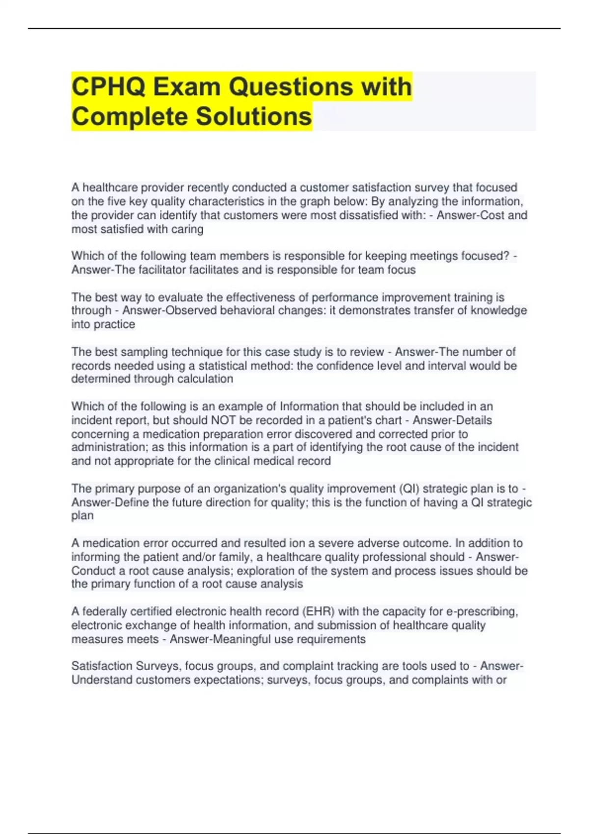CPHQ Exam Questions with Complete Solutions A healthcare provider recently conducted a customer satisfaction survey that focused on the five key quality characteristics in the graph below: By analyzing the information, the provider can identify that customers were most dissatisfied with: - Answer-Cost and most satisfied with caring Which of the following team members is responsible for keeping meetings focused? - Answer-The facilitator facilitates and is responsible for team focus The best way to evaluate the effectiveness of performance improvement training is through - Answer-Observed behavioral changes: it demonstrates transfer of knowledge into practice The best sampling technique for this case study is to review - Answer-The number of records needed using a statistical method: the confidence level and interval would be determined through calculation Which of the following is an example of Information that should be included in an incident report, but should NOT be recorded in a patient's chart - Answer-Details concerning a medication preparation error discovered and corrected prior to administration; as this information is a part of identifying the root cause of the incident and not appropriate for the clinical medical record The primary purpose of an organization's quality improvement (QI) strategic plan is to - Answer-Define the future direction for quality; this is the function of having a QI strategic plan A medication error occurred and resulted ion a severe adverse outcome. In addition to informing the patient and/or family, a healthcare quality professional should - AnswerConduct a root cause analysis; exploration of the system and process issues should be the primary function of a root cause analysis A federally certified electronic health record (EHR) with the capacity for e-prescribing, electronic exchange of health information, and submission of healthcare quality measures meets - Answer-Meaningful use requirements Satisfaction Surveys, focus groups, and complaint tracking are tools used to - AnswerUnderstand customers expectations; surveys, focus groups, and complaints with or from customers can provide information directly from the customers regarding a variety of topics including customer expectations Deemed status refers to - Answer-Accreditation equivalency with a Centers for Medicare and Medicaid Services (CMS) survey; CMS allows deemed status with meeting all conditions of participation requirements through Joint Commission Accreditation A clinical pathway on the management of hip fractures has been developed by a multidisciplinary team and implemented in a large teaching hospital. After monitoring for 6 months, the length of stay continues to exceed the guidelines. Which of the following should be the next step? - Answer-Evaluate compliance with the pathway; evaluation of compliance with the proven pathway should be conducted first to see if that may be influencing the lack of change in the outcome