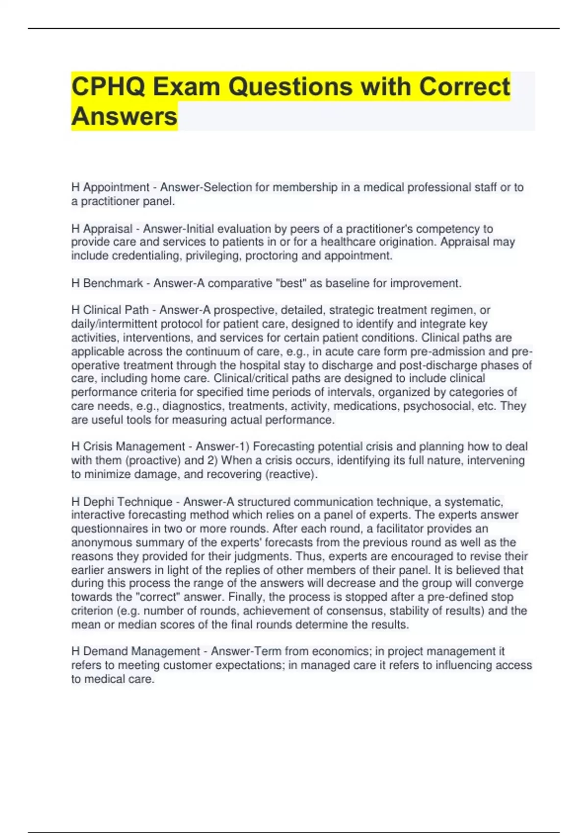 CPHQ Exam Questions with Correct Answers H Appointment - Answer-Selection for membership in a medical professional staff or to a practitioner panel. H Appraisal - Answer-Initial evaluation by peers of a practitioner's competency to provide care and services to patients in or for a healthcare origination. Appraisal may include credentialing, privileging, proctoring and appointment. H Benchmark - Answer-A comparative "best" as baseline for improvement. H Clinical Path - Answer-A prospective, detailed, strategic treatment regimen, or daily/intermittent protocol for patient care, designed to identify and integrate key activities, interventions, and services for certain patient conditions. Clinical paths are applicable across the continuum of care, e.g., in acute care form pre-admission and preoperative treatment through the hospital stay to discharge and post-discharge phases of care, including home care. Clinical/critical paths are designed to include clinical performance criteria for specified time periods of intervals, organized by categories of care needs, e.g., diagnostics, treatments, activity, medications, psychosocial, etc. They are useful tools for measuring actual performance. H Crisis Management - Answer-1) Forecasting potential crisis and planning how to deal with them (proactive) and 2) When a crisis occurs, identifying its full nature, intervening to minimize damage, and recovering (reactive). H Dephi Technique - Answer-A structured communication technique, a systematic, interactive forecasting method which relies on a panel of experts. The experts answer questionnaires in two or more rounds. After each round, a facilitator provides an anonymous summary of the experts' forecasts from the previous round as well as the reasons they provided for their judgments. Thus, experts are encouraged to revise their earlier answers in light of the replies of other members of their panel. It is believed that during this process the range of the answers will decrease and the group will converge towards the "correct" answer. Finally, the process is stopped after a pre-defined stop criterion (e.g. number of rounds, achievement of consensus, stability of results) and the mean or median scores of the final rounds determine the results. H Demand Management - Answer-Term from economics; in project management it refers to meeting customer expectations; in managed care it refers to influencing access to medical care. H Disease Management - Answer-Disease management is a system of coordinated healthcare interventions and communications for populations with conditions in which patient self-care efforts are significant. H Ethic - Answer-A set of principles of right conduct. H Ethics - Answer-Rules or standards governing conduct. H Event - Answer-An occurrence that is either deemed to be, or results in a significant problem. e.g., sentinel event, adverse event, near miss event. H E&CF Chart - Answer-Events and Causal Factors: Used to find root causes. Combines a flowchart and affinity diagram to identify both the sequence of events and relevant conditions affecting each event. H Failure Mode - Answer-The way a process can fail to function or fail to provide the desired result; an undesirable variation in a process. H FMEA - Answer-Failure Mode and Effects Analysis: A team-based quality improvement tool hat prospectively assesses, identifies, and improves steps in a process to reasonably ensure a safe and clinically desirable outcome [NCPS]: A systematic mechanism to identify and prevent product and process failures before they occur. H Flowchart - Answer-A pictorial representation displaying the actual-sequence of steps and their inter-relationships in a specific process in order to identify hand-offs, inefficiencies, redundancies, inspections, and waiting steps and/or the ideal-sequence of steps, once the actual process is known. H Force Field Analysis - Answer-A change management tool. Looks at forces for and against a change; 1) to decide if the change should be attempted or 2) used to create strategies to increase support and decrease opposition. H Gantt Chart - Answer-Project planning tool for developing schedules; a graphic display of individual parts of a quality improvement process as bars on a horizontal time scale. H HAI - Answer-Healthcare-Associated Infection: Replaces "nosocomial infection" (hospital-acquired) because it implies all health care and is not limited to hospitals. {More general Healthcare-Acquired Conditions {HAC}} H Iatrogenic - Answer-An infection or other complication of treatment induced in a patient by a physician's or other licensed independent practitioner's activity, manner, or therapy.