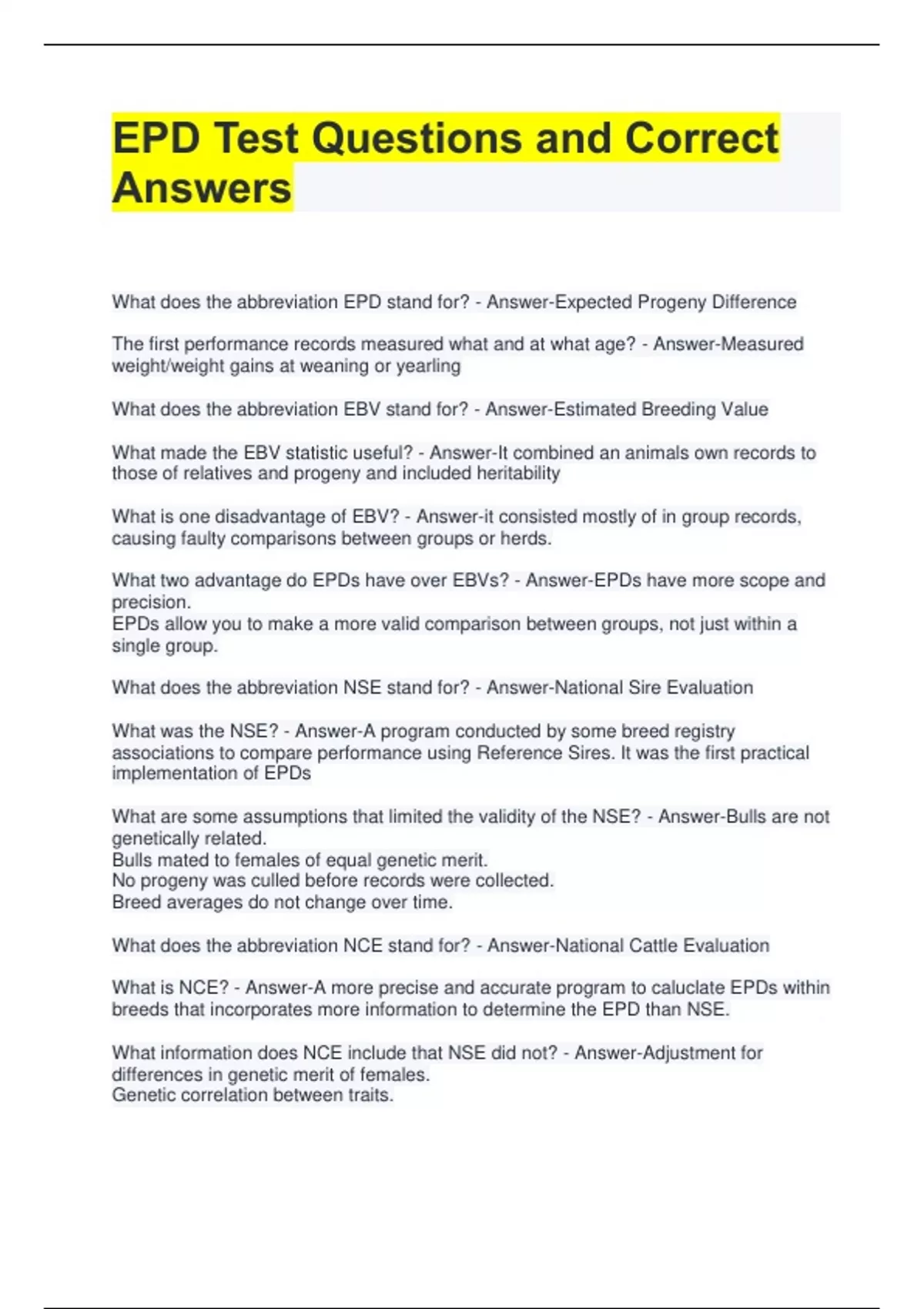 EPD Test Questions and Correct Answers What does the abbreviation EPD stand for? - Answer-Expected Progeny Difference The first performance records measured what and at what age? - Answer-Measured weight/weight gains at weaning or yearling What does the abbreviation EBV stand for? - Answer-Estimated Breeding Value What made the EBV statistic useful? - Answer-It combined an animals own records to those of relatives and progeny and included heritability What is one disadvantage of EBV? - Answer-it consisted mostly of in group records, causing faulty comparisons between groups or herds. What two advantage do EPDs have over EBVs? - Answer-EPDs have more scope and precision. EPDs allow you to make a more valid comparison between groups, not just within a single group. What does the abbreviation NSE stand for? - Answer-National Sire Evaluation What was the NSE? - Answer-A program conducted by some breed registry associations to compare performance using Reference Sires. It was the first practical implementation of EPDs What are some assumptions that limited the validity of the NSE? - Answer-Bulls are not genetically related. Bulls mated to females of equal genetic merit. No progeny was culled before records were collected. Breed averages do not change over time. What does the abbreviation NCE stand for? - Answer-National Cattle Evaluation What is NCE? - Answer-A more precise and accurate program to caluclate EPDs within breeds that incorporates more information to determine the EPD than NSE. What information does NCE include that NSE did not? - Answer-Adjustment for differences in genetic merit of females. Genetic correlation between traits.