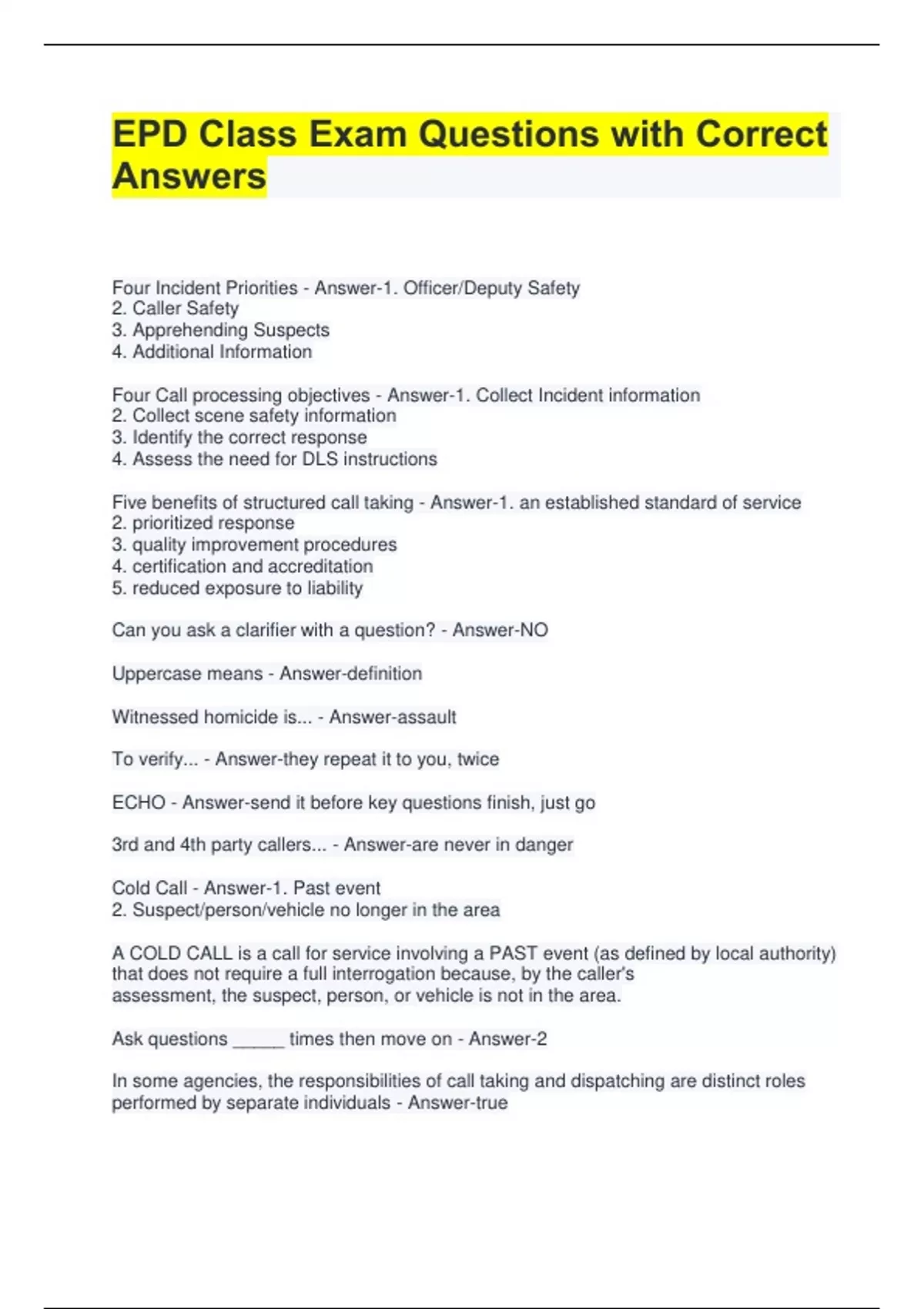 EPD Class Exam Questions with Correct Answers Four Incident Priorities - Answer-1. Officer/Deputy Safety 2. Caller Safety 3. Apprehending Suspects 4. Additional Information Four Call processing objectives - Answer-1. Collect Incident information 2. Collect scene safety information 3. Identify the correct response 4. Assess the need for DLS instructions Five benefits of structured call taking - Answer-1. an established standard of service 2. prioritized response 3. quality improvement procedures 4. certification and accreditation 5. reduced exposure to liability Can you ask a clarifier with a question? - Answer-NO Uppercase means - Answer-definition Witnessed homicide is... - Answer-assault To verify... - Answer-they repeat it to you, twice ECHO - Answer-send it before key questions finish, just go 3rd and 4th party callers... - Answer-are never in danger Cold Call - Answer-1. Past event 2. Suspect/person/vehicle no longer in the area A COLD CALL is a call for service involving a PAST event (as defined by local authority) that does not require a full interrogation because, by the caller's assessment, the suspect, person, or vehicle is not in the area. Ask questions _____ times then move on - Answer-2 In some agencies, the responsibilities of call taking and dispatching are distinct roles performed by separate individuals - Answer-true