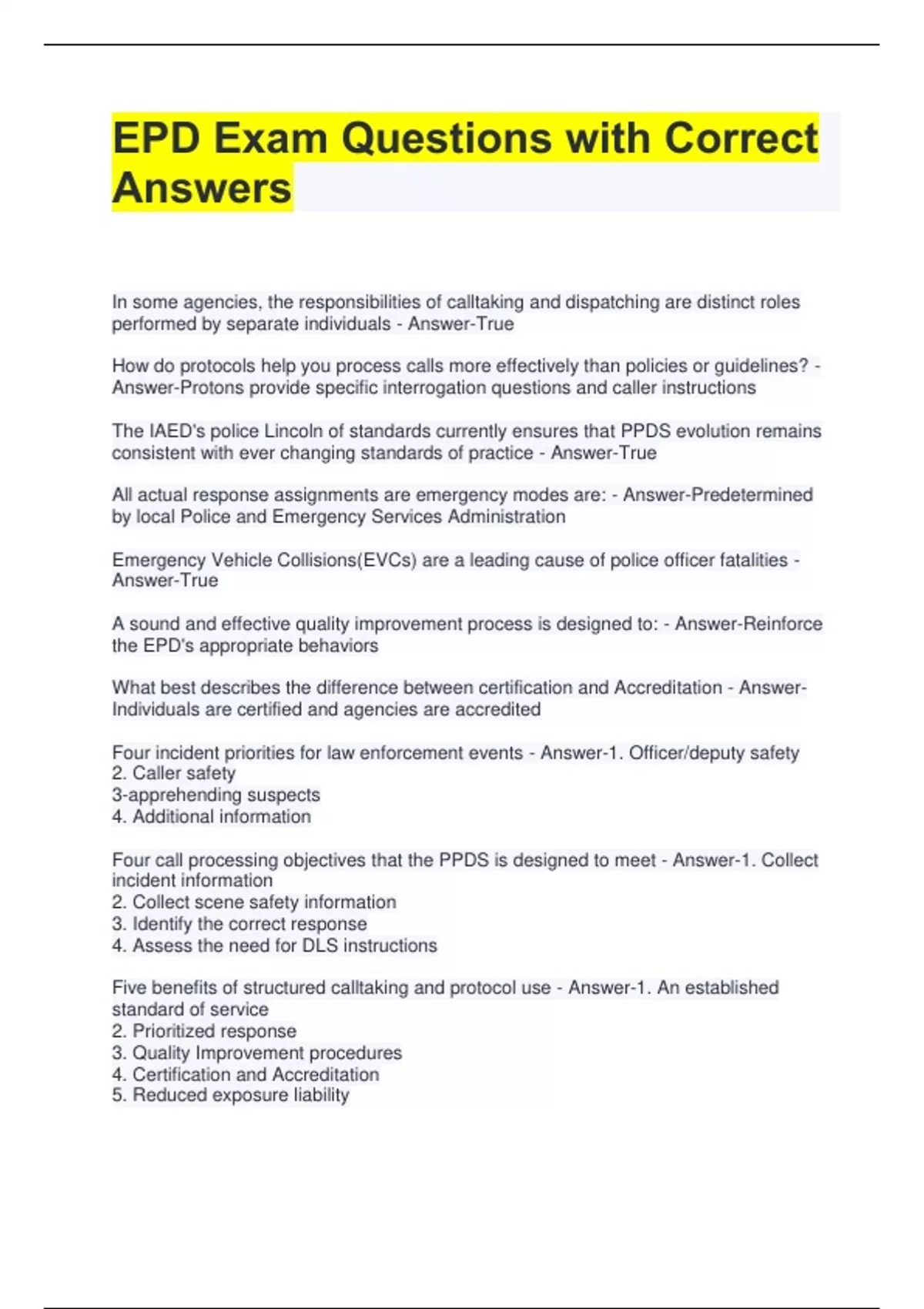 EPD Exam Questions with Correct Answers In some agencies, the responsibilities of calltaking and dispatching are distinct roles performed by separate individuals - Answer-True How do protocols help you process calls more effectively than policies or guidelines? - Answer-Protons provide specific interrogation questions and caller instructions The IAED's police Lincoln of standards currently ensures that PPDS evolution remains consistent with ever changing standards of practice - Answer-True All actual response assignments are emergency modes are: - Answer-Predetermined by local Police and Emergency Services Administration Emergency Vehicle Collisions(EVCs) are a leading cause of police officer fatalities - Answer-True A sound and effective quality improvement process is designed to: - Answer-Reinforce the EPD's appropriate behaviors What best describes the difference between certification and Accreditation - AnswerIndividuals are certified and agencies are accredited Four incident priorities for law enforcement events - Answer-1. Officer/deputy safety 2. Caller safety 3-apprehending suspects 4. Additional information Four call processing objectives that