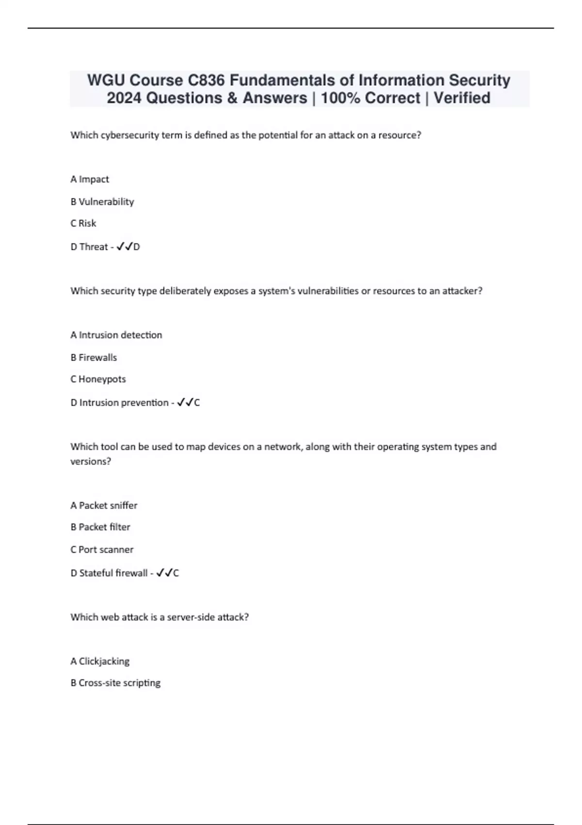 Which cybersecurity term is defined as the potential for an attack on a resource? A Impact B Vulnerability C Risk D Threat - D Which security type deliberately exposes a system's vulnerabilities or resources to an attacker? A Intrusion detection B Firewalls C Honeypots D Intrusion prevention - C Which tool can be used to map devices on a network, along with their operating system types and versions? A Packet sniffer B Packet filter C Port scanner D Stateful firewall - C