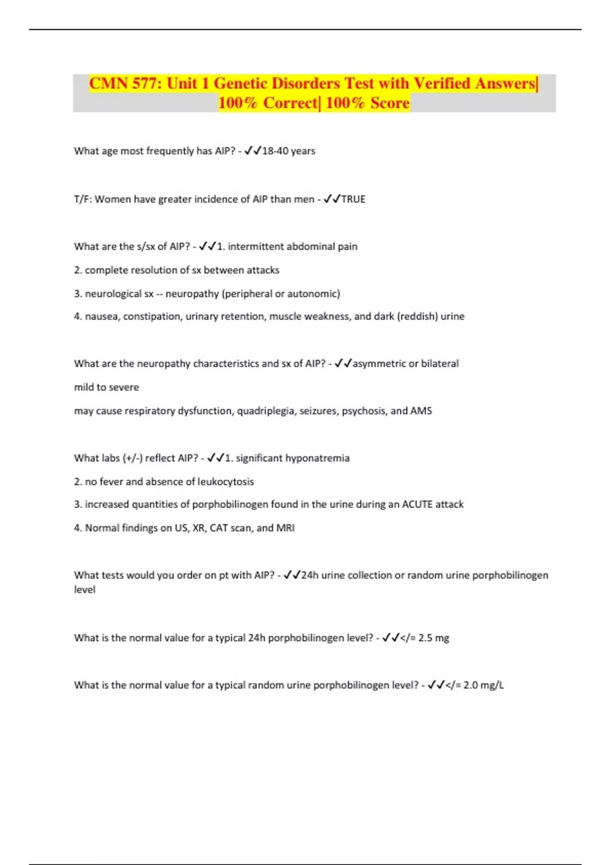 CMN 577: Unit 1 Genetic Disorders Test with Verified Answers| 100% Correct| 100% Score What age most frequently has AIP? - 18-40 years T/F: Women have greater incidence of AIP than men - TRUE What are the s/sx of AIP? - 1. intermittent abdominal pain 2. complete resolution of sx between attacks 3. neurological sx -- neuropathy (peripheral or autonomic) 4. nausea, constipation, urinary retention, muscle weakness, and dark (reddish) urine What are the neuropathy characteristics and sx of AIP? - asymmetric or bilateral mild to severe may cause respiratory dysfunction, quadriplegia, seizures, psychosis, and AMS