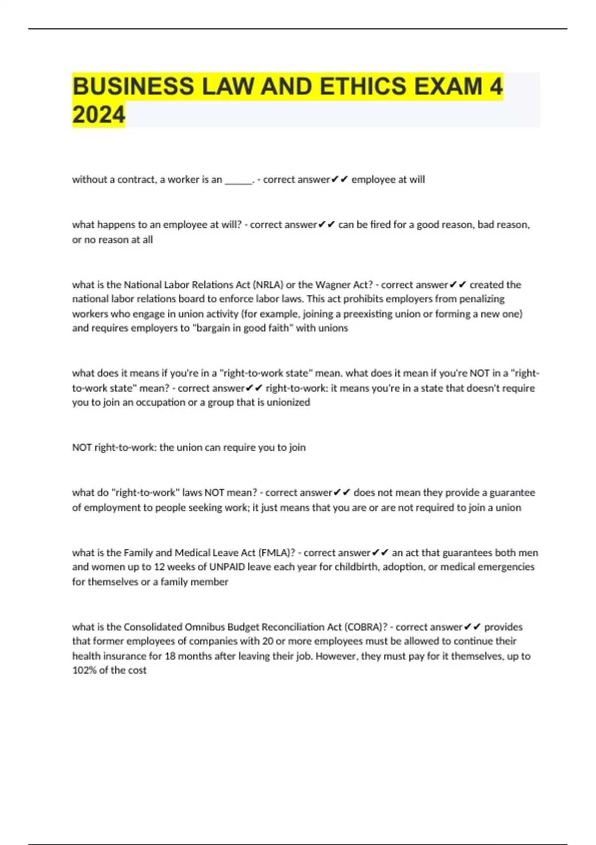 without a contract, a worker is an _____. - correct answer employee at will what happens to an employee at will? - correct answer can be fired for a good reason, bad reason, or no reason at all what is the National Labor Relations Act (NRLA) or the Wagner Act? - correct answer created the national labor relations board to enforce labor laws. This act prohibits employers from penalizing workers who engage in union activity (for example, joining a preexisting union or forming a new one) and requires employers to "bargain in good faith" with unions what does it means if you're in a "right-to-work state" mean. what does it mean if you're NOT in a "right-to-work state" mean? - correct answer right-to-work: it means you're in a state that doesn't require you to join an occupation or a group that is unionized NOT right-to-work: the union can require you to join what do "right-to-work" laws NOT mean? - correct answer does not mean they provide a guarantee of employment to people seeking work; it just means that you are or are not required to join a union what is the Family and Medical Leave Act (FMLA)? - correct answer an act that guarantees both men and women up to 12 weeks of UNPAID leave each year for childbirth, adoption, or medical emergencies for themselves or a family member what is the Consolidated Omnibus Budget Reconciliation Act (COBRA)? - correct answer provides that former employees of companies with 20 or more employees must be allowed to continue their health insurance for 18 months after leaving their job. However, they must pay for it themselves, up to 102% of the cost