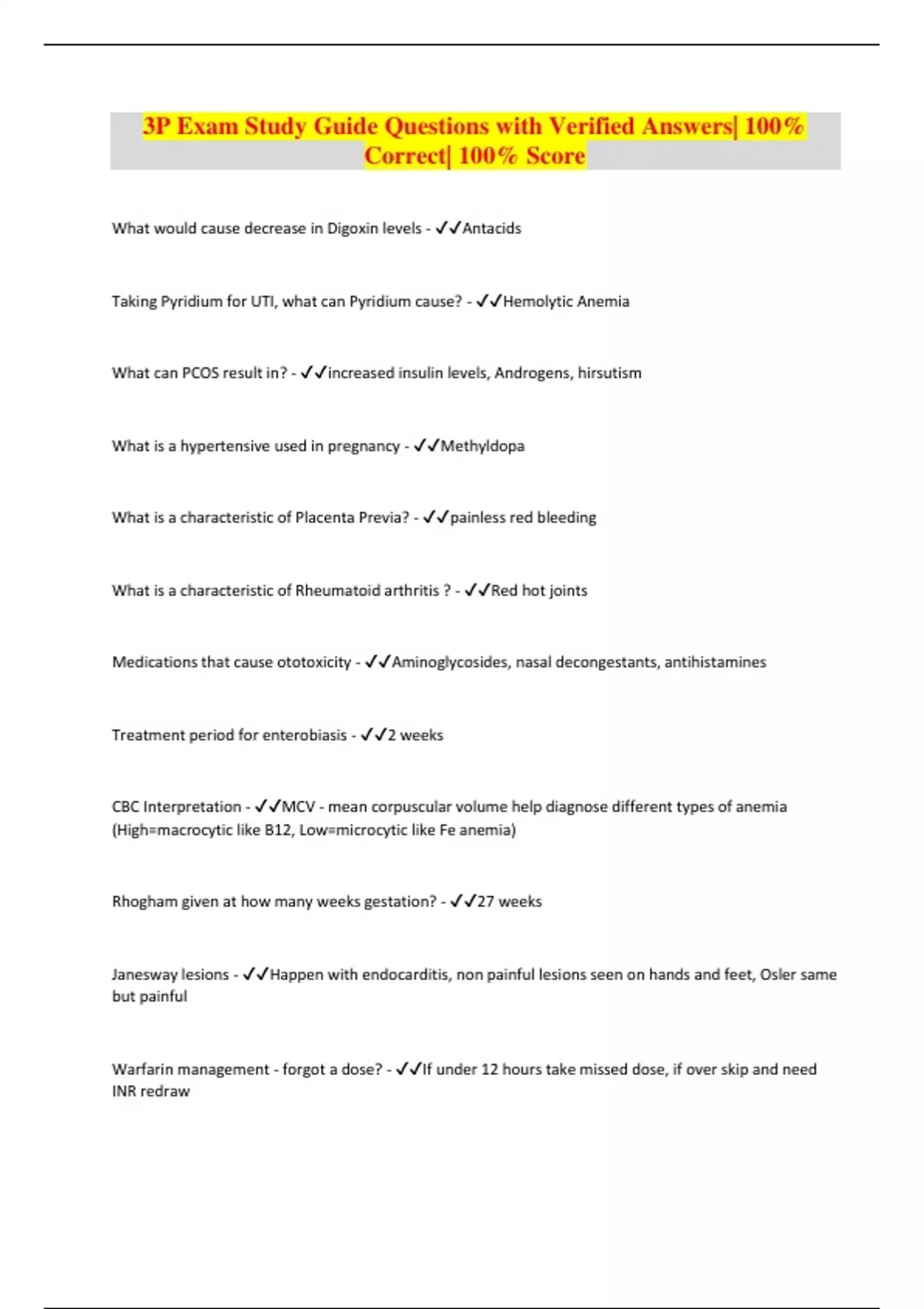3P Exam Study Guide Questions with Verified Answers| 100% Correct| 100% Score What would cause decrease in Digoxin levels - Antacids Taking Pyridium for UTI, what can Pyridium cause? - Hemolytic Anemia What can PCOS result in? - increased insulin levels, Androgens, hirsutism What is a hypertensive used in pregnancy - Methyldopa What is a characteristic of Placenta Previa? - painless red bleeding What is a characteristic of Rheumatoid arthritis ? - Red hot joints Medications that cause ototoxicity - Aminoglycosides, nasal decongestants, antihistamines Treatment period for enterobiasis - 2 weeks CBC Interpretation - MCV - mean corpuscular volume help diagnose different types of anemia (High=macrocytic like B12, Low=microcytic like Fe anemia) Rhogham given at how many weeks gestation? - 27 weeks Janesway lesions - Happen with endocarditis, non painful lesions seen on hands and feet, Osler same but painful Warfarin management - forgot a dose? - If under 12 hours take missed dose, if over skip and need INR redraw
