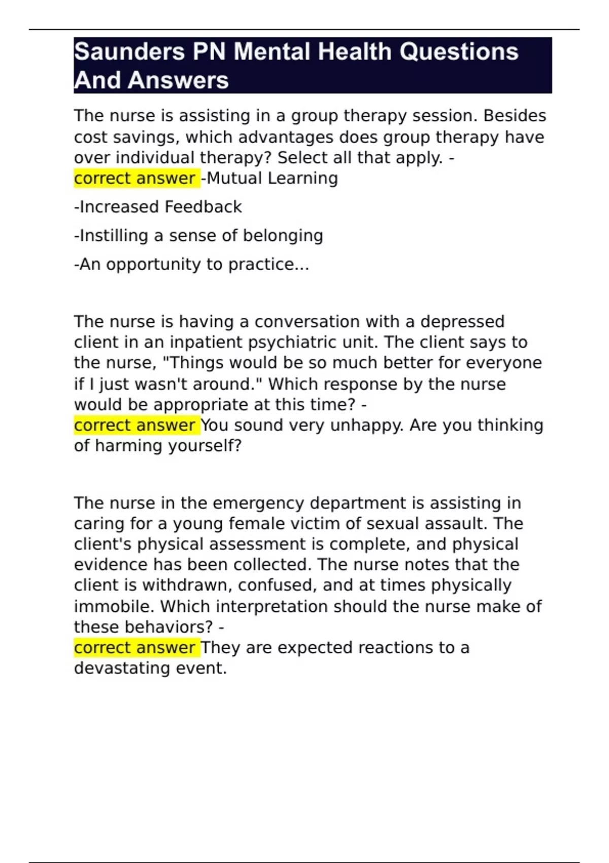 Saunders PN Mental Health Questions And Answers