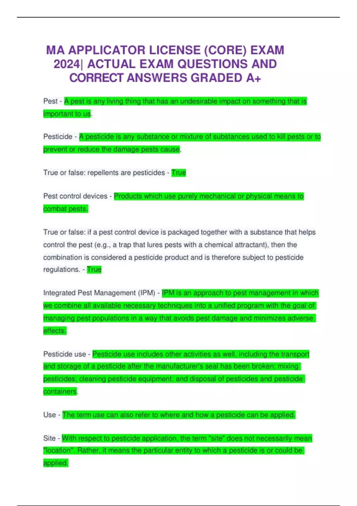 MA APPLICATOR LICENSE (CORE) EXAM 2024| ACTUAL EXAM QUESTIONS AND CORRECT ANSWERS GRADED A+