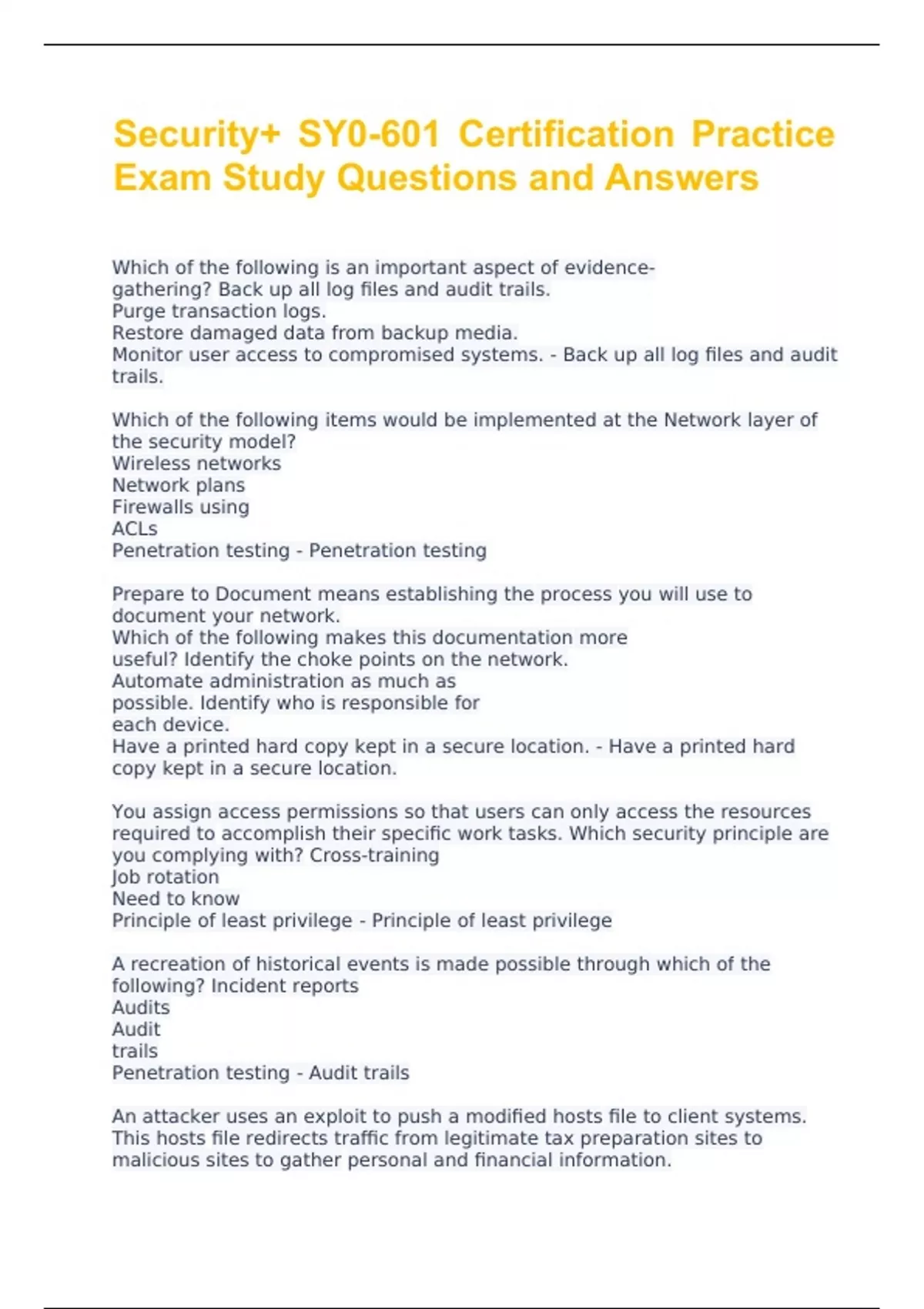 Security+ SY0-601 Certification Practice Exam Study Questions and Answers