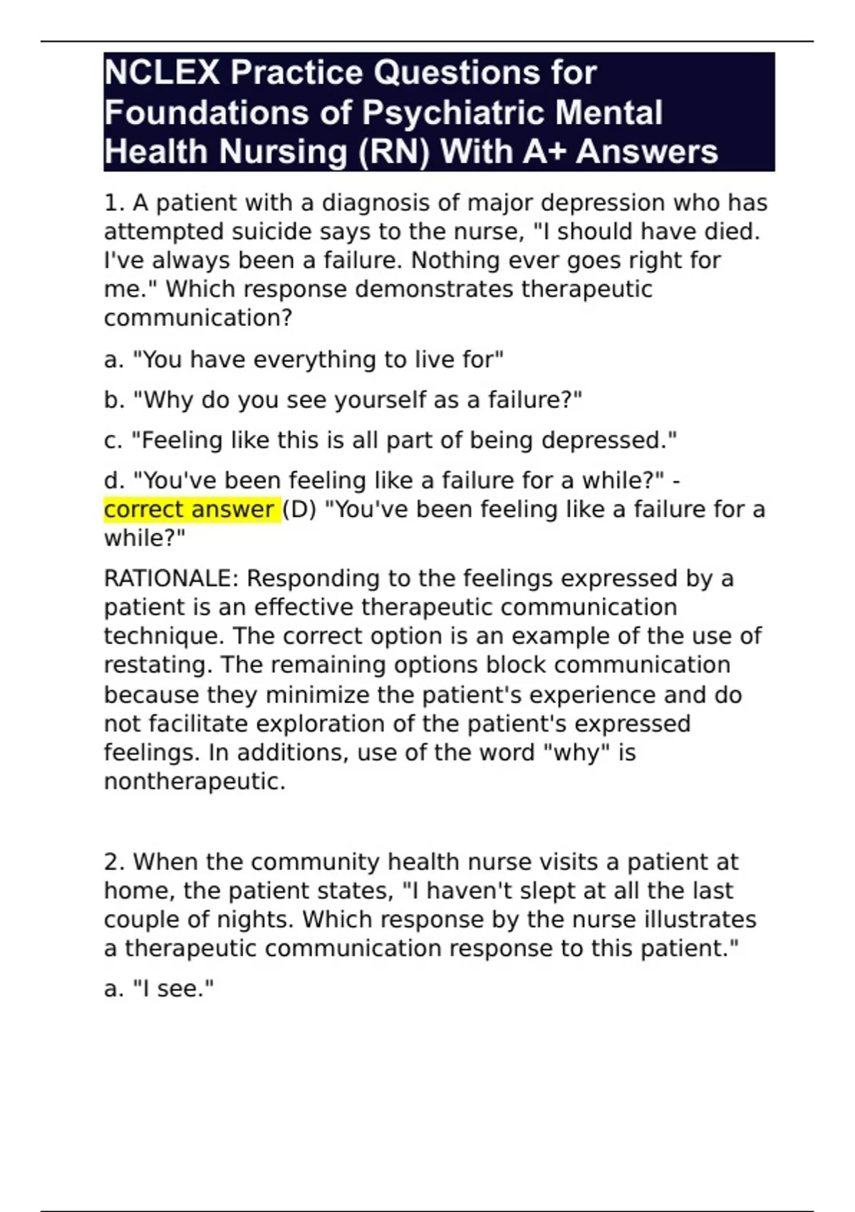NCLEX Practice Questions for Foundations of Psychiatric Mental Health Nursing (RN) With A+ Answers