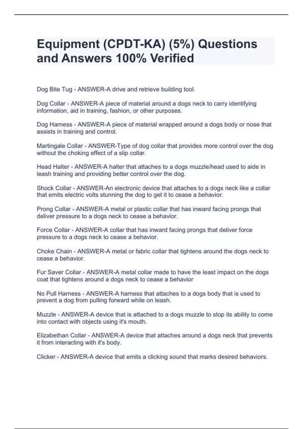 Equipment (CPDT-KA) (5%) Questions and Answers 100% Verified Equipment (CPDT-KA) (5%) Questions and Answers 100% Verified Equipment (CPDT-KA) (5%) Questions and Answers 100% Verified Equipment (CPDT-KA) (5%) Questions and Answers 100% Verified Dog Bite Tug - ANSWER-A drive and retrieve building tool. Dog Collar - ANSWER-A piece of material around a dogs neck to carry identifying information, aid in training, fashion, or other purposes. Dog Harness - ANSWER-A piece of material wrapped around a dogs body or nose that assists in training and control.