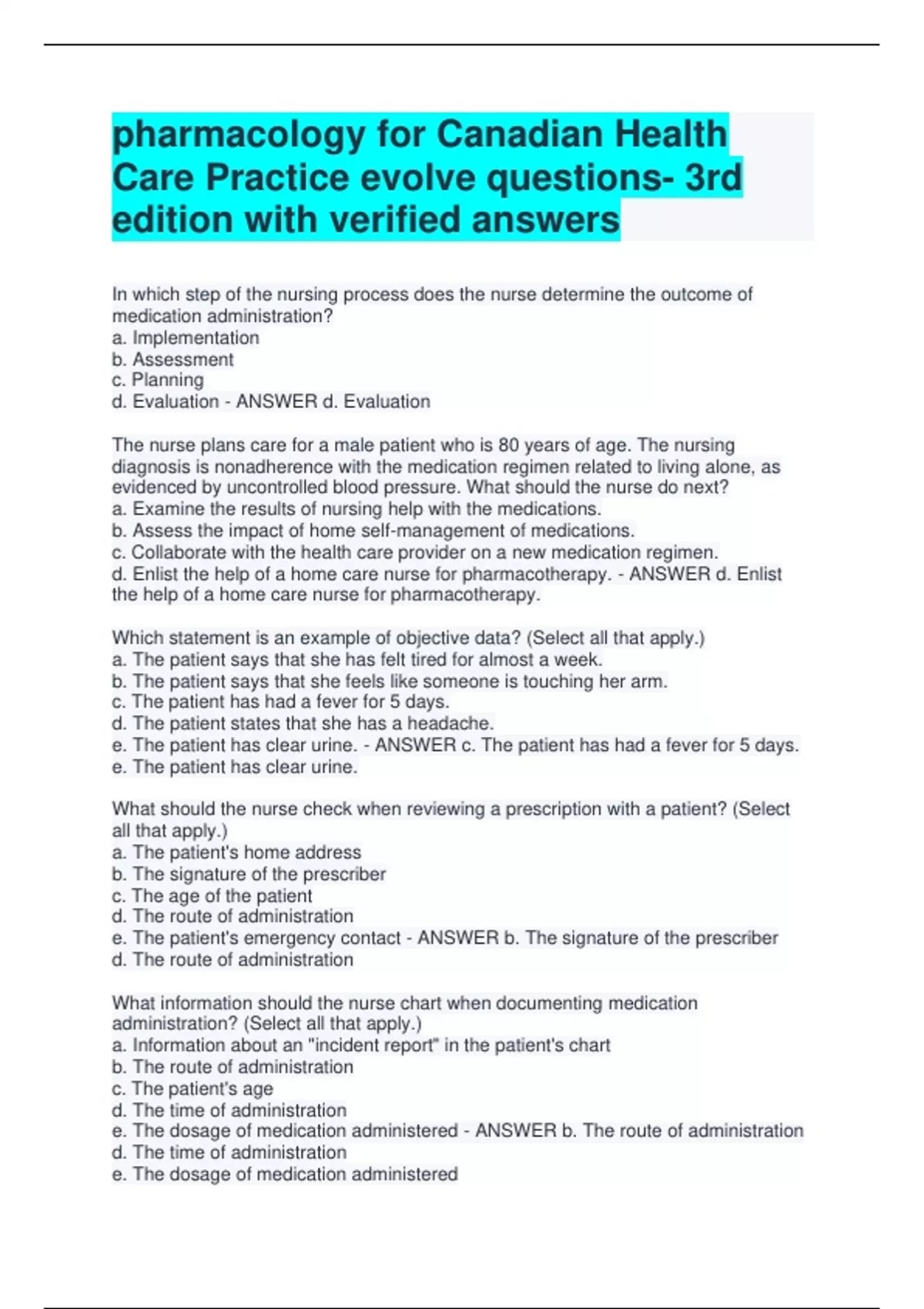 pharmacology for Canadian Health Care Practice evolve questions- 3rd edition with verified answers In which step of the nursing process does the nurse determine the outcome of medication administration? a. Implementation b. Assessment c. Planning d. Evaluation - ANSWER d. Evaluation The nurse plans care for a male patient who is 80 years of age. The nursing diagnosis is nonadherence with the medication regimen related to living alone, as evidenced by uncontrolled blood pressure. What should the nurse do next? a. Examine the results of nursing help with the medications. b. Assess the impact of home self-management of medications. c. Collaborate with the health care provider on a new medication regimen. d. Enlist the help of a home care nurse for pharmacotherapy. - ANSWER d. Enlist the help of a home care nurse for pharmacotherapy. Which statement is an example of objective data? (Select all that apply.) a. The patient says that she has felt tired for almost a week. b. The patient says that she feels like someone is touching her arm. c. The patient has had a fever for 5 days. d. The patient states that she has a headache. e. The patient has clear urine. - ANSWER c. The patient has had a fever for 5 days. e. The patient has clear urine. What should the nurse check when reviewing a prescription with a patient? (Select all that apply.) a. The patient's home address b. The signature of the prescriber c. The age of the patient d. The route of administration e. The patient's emergency contact - ANSWER b. The signature of the prescriber d. The route of administration What information should the nurse chart when documenting medication administration? (Select all that apply.) a. Information about an "incident report" in the patient's chart b. The route of administration c. The patient's age d. The time of administration e. The dosage of medication administered - ANSWER b. The route of administration d. The time of administration e. The dosage of medication administered What is the study of physiochemical properties of drugs and how drugs influence the body called? a. Pharmacokinetics b. Pharmacodynamics c. Pharmacology d. Pharmacotherapeutics - ANSWER b. Pharmacodynamics Which statement best describes pharmacokinetics? a. Physiologic interaction between a drug and body cells b. What the body does to the drug after it is administered c. Conversion of medication into its active chemical substance d. Adverse effects and toxic reactions to medications - ANSWER b. What the body does to the drug after it is administered Which nursing action will increase the absorption of a medication administered intramuscularly? a. Administering the medication via the Z-track method. b. Applying ice packs to the injection site. c. Massaging the site after injection. d. Lowering the extremity below the level of the heart. - ANSWER c. Massaging the site after injection. When administering two medications that are highly protein bound, the nurse understands to monitor the patient carefully for which effect? a. A short duration of medication action b. Hypovolemic shock caused by a low albumin level c. Increase in the risk of drug-drug interactions d. Immediate improvement in the patient's condition - ANSWER c. Increase in the risk of drug-drug interactions What is the ratio between a drug's therapeutic effects and toxic effects called? a. Therapeutic index b. Cumulative effect c. Tolerance d. Affinity - ANSWER a. Therapeutic index A patient asks the nurse why the dose of IV pain medication being given is lower than that of the patient's previous oral medication. What is the nurse's best response to the patient? a. "Medications given intravenously are not affected by the first-pass effect." b. "Medications given orally bypass the portal circulatory system." c. "A large percentage of an intravenously administered drug is metabolized into inactive metabolites in the liver." d. "Drugs administered intravenously enter the portal system before systemic distribution." - ANSWER a. "Medications given intravenously are not affected by the first-pass effect." The nurse understands that drugs exert their actions on the body by what process? (Select all that apply.) a. Interacting with receptors b. Making the cell perform a new function c. Inhibiting the action of a specific enzyme d. Altering metabolic chemical processes - ANSWER a. Interacting with receptors c. Inhibiting the action of a specific enzyme d. Altering metabolic chemical processes The nurse knows that which factors will affect the absorption of orally administered medications? (Select all that apply.) a. Time of day b. Patient in high Fowler's position c. pH of the stomach d. Presence of food in the stomach e. Form of drug preparation - ANSWER a. Time of day c. pH of the stomach d. Presence of food in the stomach e. Form of drug preparation What is another term for biotransformation of a drug? a. Dilution b. Excretion c. Metabolism d. Absorption - ANSWER c. Metabolism A drug given by which route is altered by the first-pass effect? a. Sublingual b. Oral c. Subcutaneous d. Intravenous (IV) - ANSWER b. Oral Drug's half-life is defined as the amount of time required for 50% of a drug to a. be absorbed by the body. b. exert a response. c. reach a therapeutic level. d. be eliminated by the body. - ANSWER d. be eliminated by the body. To achieve the most rapid onset of action, the health care provider will prescribe the medication to be administered by which route? a. Subcutaneous (SC) b. Intramuscular (IM) c. Intravenous (IV) d. Intrathecally - ANSWER c. Intravenous (IV) Patients with renal failure would most likely have problems with which pharmacokinetic process? a. Metabolism b. Distribution c. Absorption d. Excretion - ANSWER d. Excretion