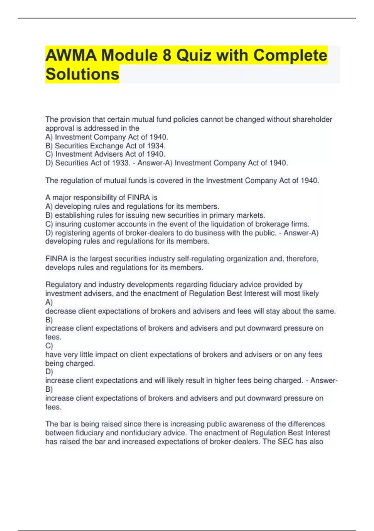 AWMA Module 8 Quiz with Complete Solutions The provision that certain mutual fund policies cannot be changed without shareholder approval is addressed in the A) Investment Company Act of 1940. B) Securities Exchange Act of 1934. C) Investment Advisers Act of 1940. D) Securities Act of 1933. - Answer-A) Investment Company Act of 1940. The regulation of mutual funds is covered in the Investment Company Act of 1940. A major responsibility of FINRA is A) developing rules and regulations for its members. B) establishing rules for issuing new securities in primary markets. C) insuring customer accounts in the event of the liquidation of brokerage firms. D) registering agents of broker-dealers to do business with the public. - Answer-A) developing rules and regulations for its members. FINRA is the largest securities industry self-regulating organization and, therefore, develops rules and regulations for its members. Regulatory and industry developments regarding fiduciary advice provided by investment advisers, and the enactment of Regulation Best Interest will most likely A) decrease client expectations of brokers and advisers and fees will stay about the same. B) increase client expectations of brokers and advisers and put downward pressure on fees. C) have very little impact on client expectations of brokers and advisers or on any fees being charged. D) increase client expectations and will likely result in higher fees being charged. - AnswerB) increase client expectations of brokers and advisers and put downward pressure on fees. The bar is being raised since there is increasing public awareness of the differences between fiduciary and nonfiduciary advice. The enactment of Regulation Best Interest has raised the bar and increased expectations of broker-dealers. The SEC has also released guidance on the fiduciary duties that advisers owe to their clients. These developments will increase client expectations of brokers and advisers and put downward pressure on fees and the sale of certain products, especially complex high fee products that are now being discouraged. Which act repealed a prohibition that had been in place preventing financial institutions from offering a combination of commercial banking, investment banking, and insurance services? A) Gramm-Leach-Bliley Act of 1999 B) USA Patriot Act of 2001 C) Commodity Futures Modernization Act of 2000 D) Securities Acts Amendments of 1975 - Answer-A) Gramm-Leach-Bliley Act of 1999