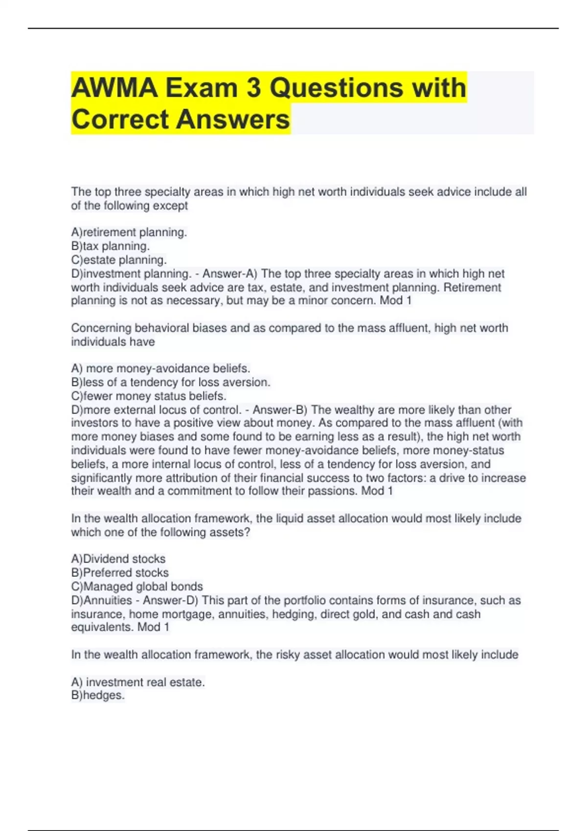 AWMA Exam 3 Questions with Correct Answers The top three specialty areas in which high net worth individuals seek advice include all of the following except A)retirement planning. B)tax planning. C)estate planning. D)investment planning. - Answer-A) The top three specialty areas in which high net worth individuals seek advice are tax, estate, and investment planning. Retirement planning is not as necessary, but may be a minor concern. Mod 1 Concerning behavioral biases and as compared to the mass affluent, high net worth individuals have A) more money-avoidance beliefs. B)less of a tendency for loss aversion. C)fewer money status beliefs. D)more external locus of control. - Answer-B) The wealthy are more likely than other investors to have a positive view about money. As compared to the mass affluent (with more money biases and some found to be earning less as a result), the high net worth individuals were found to have fewer money-avoidance beliefs, more money-status beliefs, a more internal locus of control, less of a tendency for loss aversion, and significantly more attribution of their financial success to two factors: a drive to increase their wealth and a commitment to follow their passions. Mod 1 In the wealth allocation framework, the liquid asset allocation would most likely include which one of the following assets? A)Dividend stocks B)Preferred stocks C)Managed global bonds D)Annuities - Answer-D) This part of the portfolio contains forms of insurance, such as insurance, home mortgage, annuities, hedging, direct gold, and cash and cash equivalents. Mod 1 In the wealth allocation framework, the risky asset allocation would most likely include A) investment real estate. B)hedges. C)large-cap ETFs. D)balanced mutual funds. - Answer-A) Risky assets can include many different vehicles, such as investment real estate, a small business, concentrated stock and stock options, global small company stocks, some commodities, aggressive inflation protectors, and out of the money calls/puts on currencies or bonds. Mod 1 In the wealth allocation framework, the main diversified asset allocation would most likely include A)annuities. B)hedges. C)managed global bonds. D)home mortgage - Answer-C) The main diversified assets category, the largest portion of the portfolio, is still relatively low risk; it can contain managed income investments like dividend stocks, preferred stocks, own company stock (unless risky), and managed global bonds. Mod 1 Concerning the wealth allocation framework, which one of the following portfolio structures is best recommended for a risk averse high net worth investor? A)20% liquid assets/75% main diversified assets/5% risky assets B)30% liquid assets/50% main diversified assets/20% risky assets C)25% liquid assets/60% main diversified assets/15% risky assets D)45% liquid assets/50% main diversified assets/5% risky assets - Answer-D) In the wealth allocation framework, risky investments for a risk averse high net worth investor are recommended to be only 5% to 10% of the portfolio. A minimum of 20% of liquid assets is recommended for the portfolio allocations of all risk levels. The main portfolio should be only 40%-70% of total assets. Mod 1 In the wealth allocation framework, human capital is in which one of the following portfolio "buckets"? A) Hedging assets B)Main diversified assets C)Liquid assets D)Risky assets - Answer-C) In the wealth allocation framework, human capital is included in the liquid assets "bucket." Mod 1 In the wealth allocation framework, human capital can best be defined as the high net worth individual's ability to leverage A) their children. B)their own skills, talents, connections, and/or notoriety. C) an older business to buy a new business. D)their employees. - Answer-B) Human capital does loom large for high net worth clients, as these clients' education or other skills, talents, and/or connections provide a safety net for assets. Mod 1 Which one of the following statements about the goals-based form of financial planning is correct? A) Goals-based financial planning would be adversely affected by stricter fiduciary standards. B)Taking on greater risk is necessary in goals-based financial planning. C)Goals-based financial planning is not recommended for clients of all income levels; it only works well for a high net worth client. D)To facilitate goals-based financial planning, it is important that an adviser gain trust with a client. - Answer-D) To facilitate goals-based financial planning, it is important that an adviser gain trust with a client in order to learn that client's goals and aspirations. Often, less risk is necessary as the emphasis is not in beating the market return, but in using only the risk necessary to reach the goal. This method can work well with clients of any income level. Mod 1 Which one of the following would best be considered a long-term goal for a high net worth client? A) Paying for a luxury vacation B)Upgrading their home C)Creating an emergency fund D)Setting up trusts for gifting - Answer-D) Setting up trusts for gifting to family and/or a charity would be a long-term goal for a high net worth client. Mod 1
