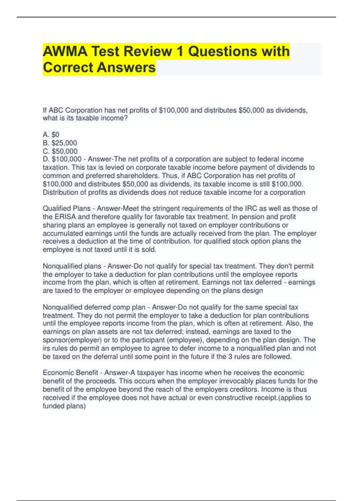 AWMA Test Review 1 Questions with Correct Answers If ABC Corporation has net profits of $100,000 and distributes $50,000 as dividends, what is its taxable income? A. $0 B. $25,000 C. $50,000 D. $100,000 - Answer-The net profits of a corporation are subject to federal income taxation. This tax is levied on corporate taxable income before payment of dividends to common and preferred shareholders. Thus, if ABC Corporation has net profits of $100,000 and distributes $50,000 as dividends, its taxable income is still $100,000. Distribution of profits as dividends does not reduce taxable income for a corporation Qualified Plans - Answer-Meet the stringent requirements of the IRC as well as those of the ERISA and therefore qualify for favorable tax treatment. In pension and profit sharing plans an employee is generally not taxed on employer contributions or accumulated earnings until the funds are actually received from the plan. The employer receives a deduction at the time of contribution. for qualified stock option plans the employee is not taxed until it is sold. Nonqualified plans - Answer-Do not qualify for special tax treatment. They don't permit the employer to take a deduction for plan contributions until the employee reports income from the plan, which is often at retirement. Earnings not tax deferred - earnings are taxed to the employer or employee depending on the plans design Nonqualified deferred comp plan - Answer-Do not qualify for the same special tax treatment. They do not permit the employer to take a deduction for plan contributions until the employee reports income from the plan, which is often at retirement. Also, the earnings on plan assets are not tax deferred; instead, earnings are taxed to the sponsor(employer) or to the participant (employee), depending on the plan design. The irs rules do permit an employee to agree to defer income to a nonqualified plan and not be taxed on the deferral until some point in the future if the 3 rules are followed. Economic Benefit - Answer-A taxpayer has income when he receives the economic benefit of the proceeds. This occurs when the employer irrevocably places funds for the benefit of the employee beyond the reach of the employers creditors. Income is thus received if the employee does not have actual or even constructive receipt.(applies to funded plans) Corporate owned life insurance - Answer-commonly used by employers to informally fund future benefit obligations such as those promised under a deferred comp plan. As the owner of the policies the employer is responsible for paying the premiums. The employer is also the beneficiary of the policies and retains all rights to policy benefits, including the cash value buildup and the death proceeds. COLI is attractive to employers because it - Answer-1. Provides psychological assurance to deferred comp plan participants that their benefit are secure. 2. reduces strain on the companys cash flow when plan distributions are due 3. provides tax-deferred, and possibly tax free buildup of cash value; and 4. enables the employer to recover some/all of the plan costs. Changes that have occurred since investment firms changed from private partnerships to publicly traded companies include all of the following except: A. risk taking has increased. B. profits can be privatized (bonuses) and losses socialized (bailouts). C. there is greater individual accountability. D. partners no longer share in both the profits and losses of the firm. - Answer-C. The repeal of Glass-Steagall accelerated the conversion of investment firms that had been structured as partnerships into publicly traded companies that took on more risk. This transferred much of the risk and accountability from general partners to public shareholders Equity REITS - Answer-Equity REITs own real estate properties and earn income from rents, and made up 94.4% of the REIT market (by capitalization) at the end of 2015. Upon the sale of the properties, a capital gain is earned. Generally, income from rents can be expected to increase each year. Equity REITs are appropriate when one objective is to provide an inflation hedge Mortgage REITs. - Answer-Mortgage REITs are similar to bond mutual funds, and make up approximately 5.6% of the REIT market. No ownership interest in the underlying real estate property exists. Instead, the fund invests in mortgages used by equity owners of the real estate properties to finance their acquisition of the properties. Mortgage REITs may also invest in GNMA. pools or other mortgage backed securities. They generally do not participate in capital gains on the sale of real estate properties, but their income is higher than that of equity REITs. Mortgage REITs do not provide inflation protection. Which one of the following is an advantage of equity REITs over mortgage REITs? - Answer-Equity REITs can participate in the appreciation of the underlying properties. Equity REITs own the underlying real estate properties, giving the owners an opportunity to participate in the net cash flows from the operation of the properties and in any appreciation in the market price of the properties. - Answer-The intent of Dodd-Frank was to "harmonize" and blend fiduciary rules that would pertain to both broker-dealers and investment advisers. Investment advisers are held to a fiduciary standard and broker-dealers to a suitability standard under the current rules One of the most important financial goals of wealthy individuals is - Answer-The moststated life goals for wealthy individuals are having good health, travelling the world, and achieving financial success. To achieve financial success, the most common financial goals are protecting wealth, assuring retirement lifestyle, minimizing taxes, and leaving an estate to their heirs.
