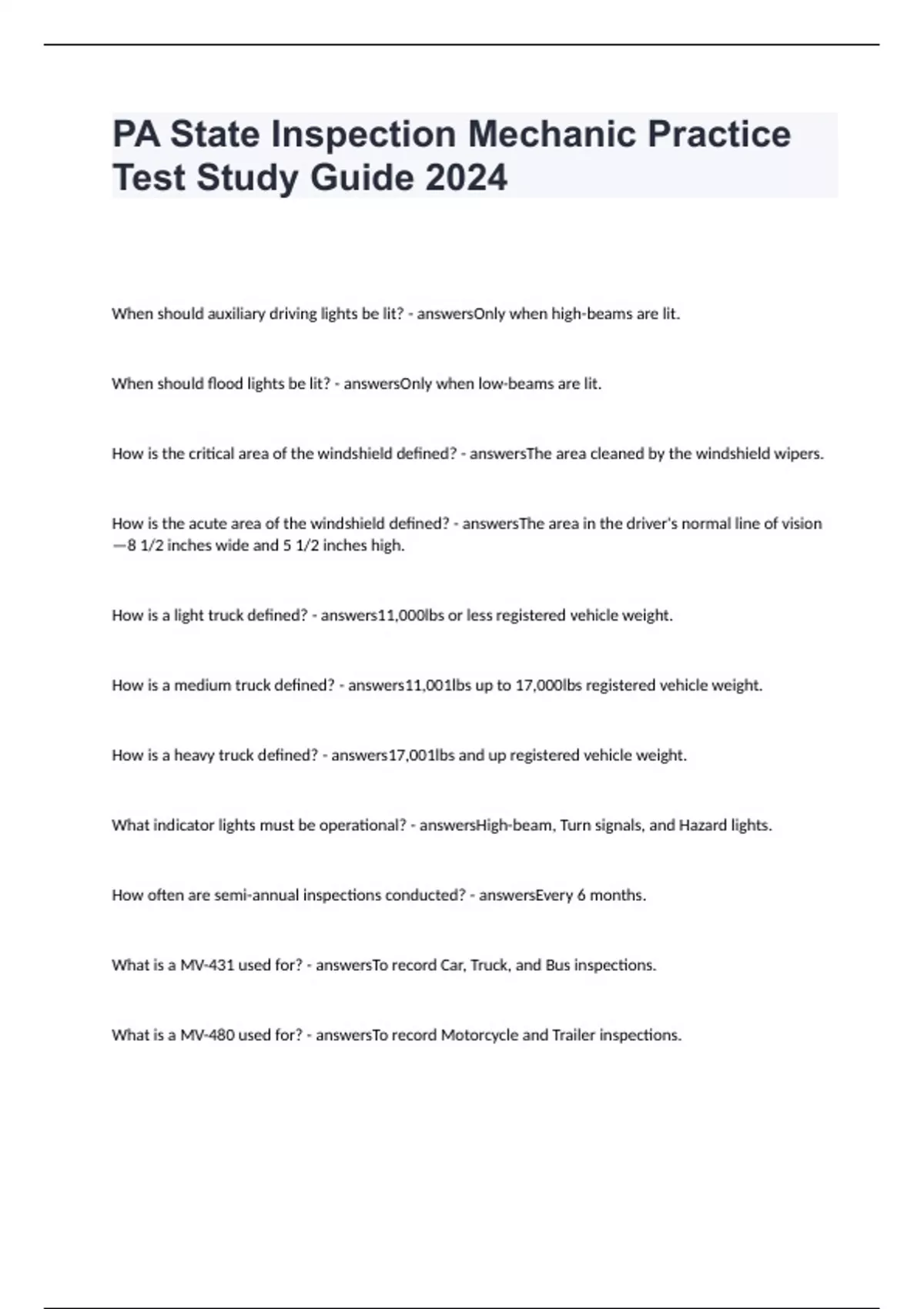 PA State Inspection Mechanic Practice Test Study Guide 2024
