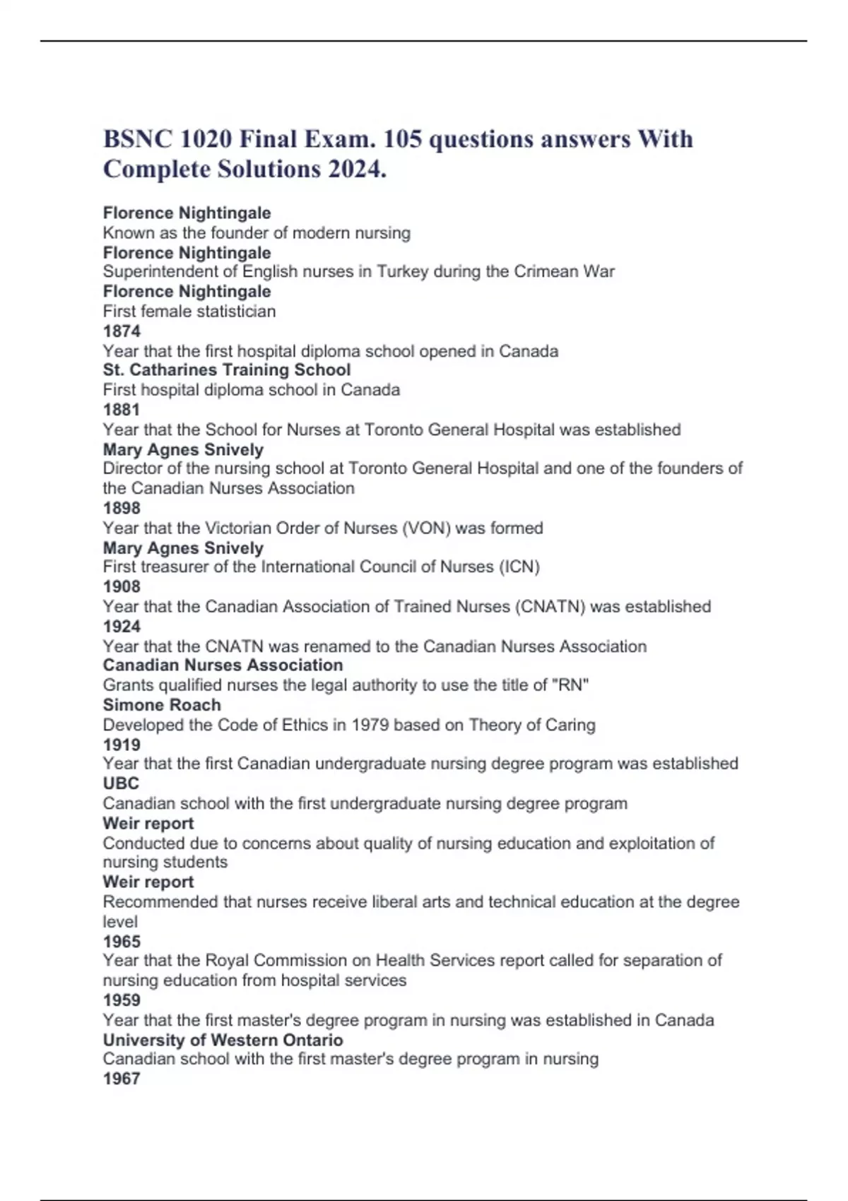 BSNC 1020 Final Exam. 105 questions answers With Complete Solutions 2024. Florence Nightingale Known as the founder of modern nursing Florence Nightingale Superintendent of English nurses in Turkey during the Crimean War Florence Nightingale First female statistician 1874 Year that the first hospital diploma school opened in Canada St. Catharines Training School First hospital diploma school in Canada 1881 Year that the School for Nurses at Toronto General Hospital was established Mary Agnes Snively Director of the nursing school at Toronto General Hospital and one of the founders of the Canadian Nurses Association 1898 Year that the Victorian Order of Nurses (VON) was formed Mary Agnes Snively First treasurer of the International Council of Nurses (ICN) 1908 Year that the Canadian Association of Trained Nurses (CNATN) was established 1924 Year that the CNATN was renamed to the Canadian Nurses Association Canadian Nurses Association Grants qualified nurses the legal authority to use the title of "RN" Simone Roach Developed the Code of Ethics in 1979 based on Theory of Caring 1919 Year that the first Canadian undergraduate nursing degree program was established UBC Canadian school with the first undergraduate nursing degree program Weir report Conducted due to concerns about quality of nursing education and exploitation of nursing students Weir report Recommended that nurses receive liberal arts and technical education at the degree level 1965 Year that the Royal Commission on Health Services report called for separation of nursing education from hospital services 1959 Year that the first master's degree program in nursing was established in Canada University of Western Ontario Canadian school with the first master's degree program in nursing 1967