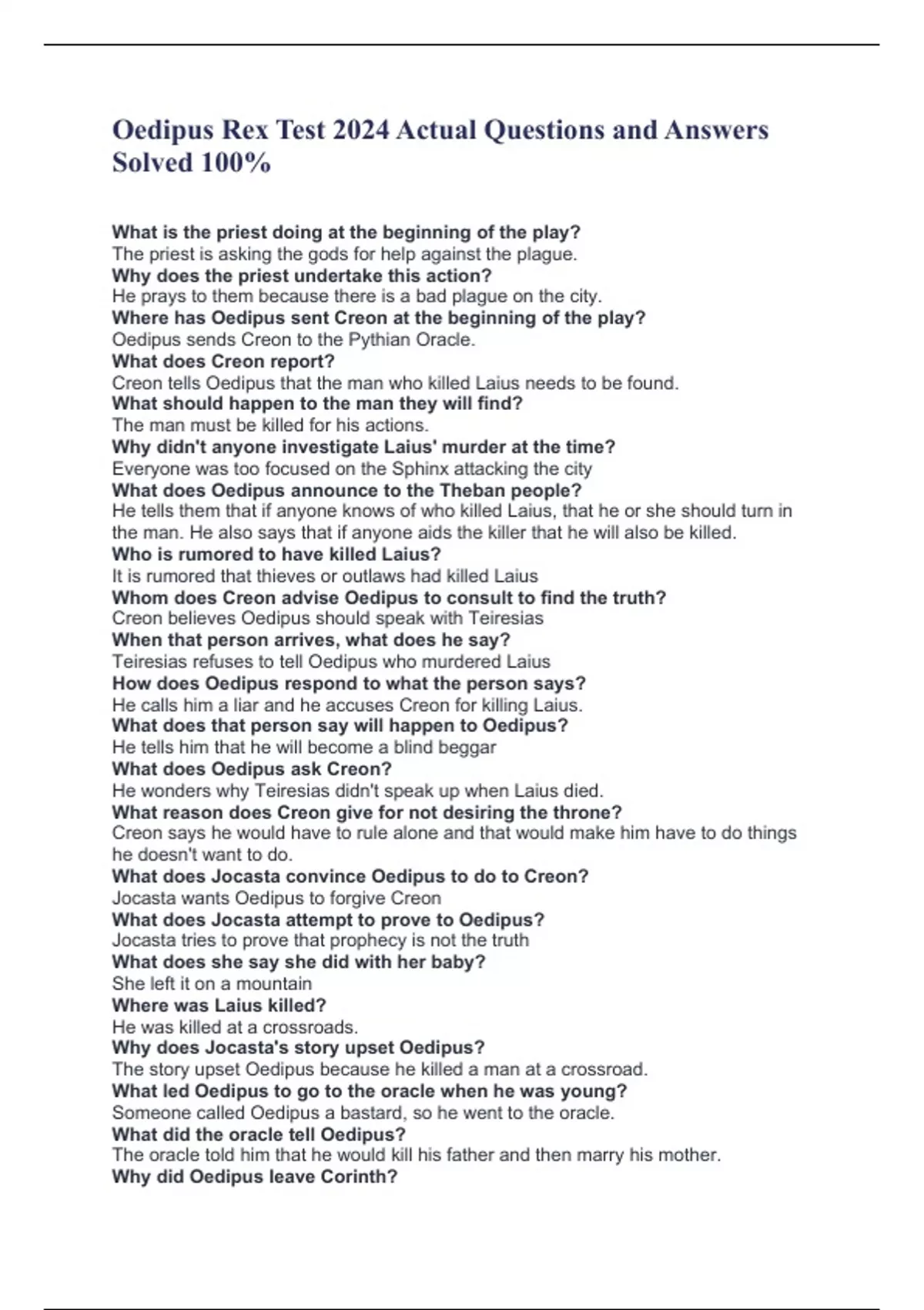 Oedipus Rex Test 2024 Actual Questions and Answers Solved 100% What is the priest doing at the beginning of the play? The priest is asking the gods for help against the plague. Why does the priest undertake this action? He prays to them because there is a bad plague on the city. Where has Oedipus sent Creon at the beginning of the play? Oedipus sends Creon to the Pythian Oracle. What does Creon report? Creon tells Oedipus that the man who killed Laius needs to be found. What should happen to the man they will find? The man must be killed for his actions. Why didn't anyone investigate Laius' murder at the time? Everyone was too focused on the Sphinx attacking the city What does Oedipus announce to the Theban people? He tells them that if anyone knows of who killed Laius, that he or she should turn in the man. He also says that if anyone aids the killer that he will also be killed. Who is rumored to have killed Laius? It is rumored that thieves or outlaws had killed Laius Whom does Creon advise Oedipus to consult to find the truth? Creon believes Oedipus should speak with Teiresias When that person arrives, what does he say? Teiresias refuses to tell Oedipus who murdered Laius How does Oedipus respond to what the person says? He calls him a liar and he accuses Creon for killing Laius. What does that person say will happen to Oedipus? He tells him that he will become a blind beggar What does Oedipus ask Creon? He wonders why Teiresias didn't speak up when Laius died. What reason does Creon give for not desiring the throne? Creon says he would have to rule alone and that would make him have to do things he doesn't want to do. What does Jocasta convince Oedipus to do to Creon? Jocasta wants Oedipus to forgive Creon What does Jocasta attempt to prove to Oedipus? Jocasta tries to prove that prophecy is not the truth What does she say she did with her baby? She left it on a mountain Where was Laius killed? He was killed at a crossroads. Why does Jocasta's story upset Oedipus? The story upset Oedipus because he killed a man at a crossroad. What led Oedipus to go to the oracle when he was young? Someone called Oedipus a bastard, so he went to the oracle. What did the oracle tell Oedipus? The oracle told him that he would kill his father and then marry his mother. Why did Oedipus leave Corinth?
