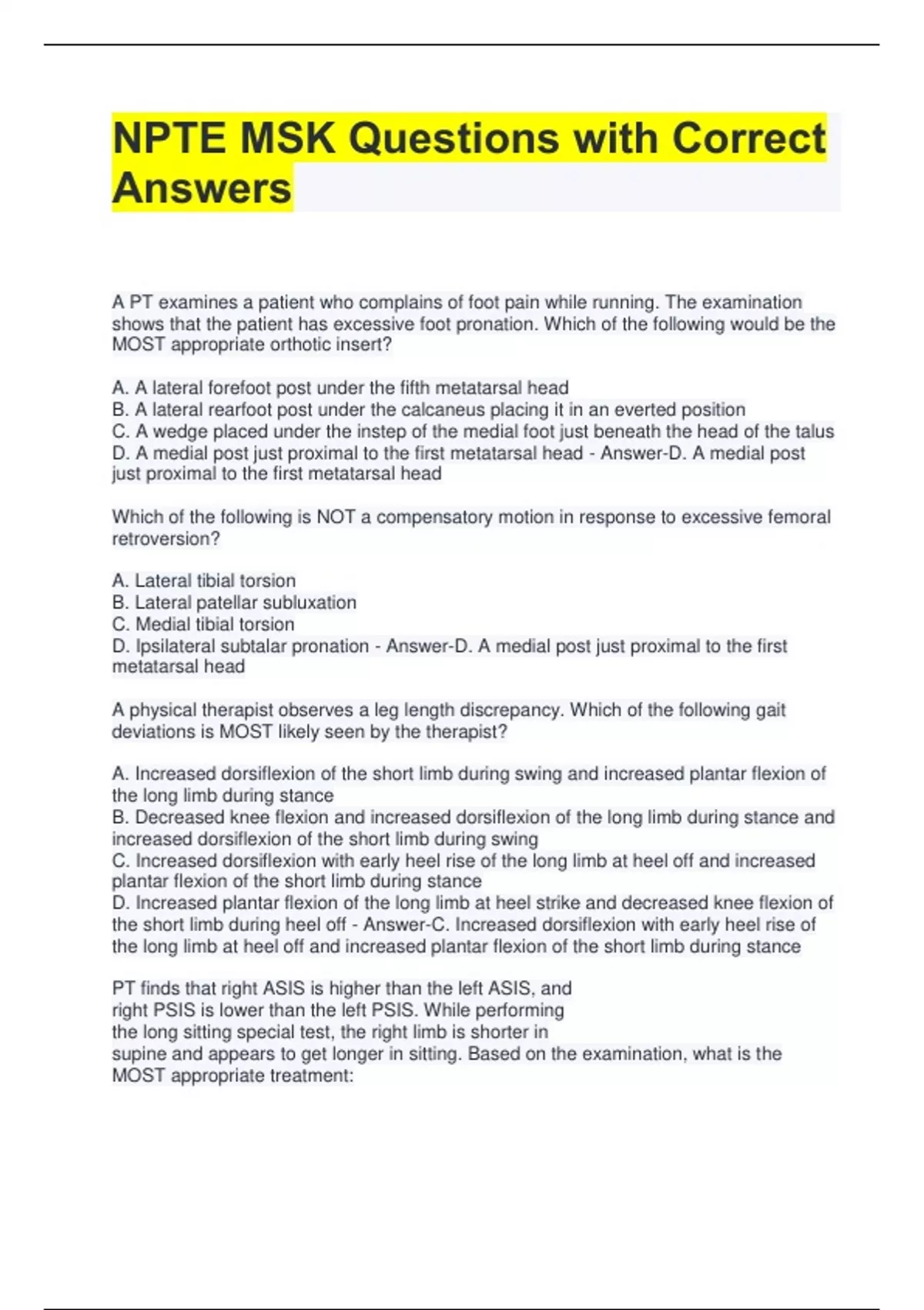 NPTE MSK Questions with Correct Answers A PT examines a patient who complains of foot pain while running. The examination shows that the patient has excessive foot pronation. Which of the following would be the MOST appropriate orthotic insert? A. A lateral forefoot post under the fifth metatarsal head B. A lateral rearfoot post under the calcaneus placing it in an everted position C. A wedge placed under the instep of the medial foot just beneath the head of the talus D. A medial post just proximal to the first metatarsal head - Answer-D. A medial post just proximal to the first metatarsal head Which of the following is NOT a compensatory motion in response to excessive femoral retroversion? A. Lateral tibial torsion B. Lateral patellar subluxation C. Medial tibial torsion D. Ipsilateral subtalar pronation - Answer-D. A medial post just proximal to the first metatarsal head A physical therapist observes a leg length discrepancy. Which of the following gait deviations is MOST likely seen by the therapist? A. Increased dorsiflexion of the short limb during swing and increased plantar flexion of the long limb during stance B. Decreased knee flexion and increased dorsiflexion of the long limb during stance and increased dorsiflexion of the short limb during swing C. Increased dorsiflexion with early heel rise of the long limb at heel off and increased plantar flexion of the short limb during stance D. Increased plantar flexion of the long limb at heel strike and decreased knee flexion of the short limb during heel off - Answer-C. Increased dorsiflexion with early heel rise of the long limb at heel off and increased plantar flexion of the short limb during stance PT finds that right ASIS is higher than the left ASIS, and right PSIS is lower than the left PSIS. While performing the long sitting special test, the right limb is shorter in supine and appears to get longer in sitting. Based on the examination, what is the MOST appropriate treatment: A. Stretch the Right Hip Extensors B. Stretch the Right Hip Flexors C. Strengthen the Right Hip Flexors D. Strengthen the Right Hip Extensors - Answer-A. Stretch the Right Hip Extensors The physical therapist notes a patient has a forward head, rounded shoulders posture. Which of the following interventions is MOST appropriate to help the patient? A. Initiate cervical flexor and extensor strengthening B. Perform grade five manipulations to the upper thoracic spine C. Initiate pectoralis minor stretching and scapular retractor strengthening D. Initiate cervical traction using 15% body weight - Answer-C. Initiate pectoralis minor stretching and scapular retractor strengthening A PT student is constantly on the new phone and is having difficulty swiping upwards with their thumb as shown in the picture below. What is the BEST mobilization to improve the thumb range of motion so that the student can swipe happily thereafter! A. Inferior glide at the CMC joint B. Superior glide at the CMC joint C. Ulnar glide at the CMC joint D. Radial glide at the CMC joint - Answer-D. Radial glide at the CMC joint In order to unlock the knee from terminal extension in a closed kinetic chain, which of the following must occur? A. Lateral (external) rotation of the femur on the tibia B. Superior glide of the patella on the femur C. Lateral (external) rotation of the tibia on the femur D. Long axis distraction at the knee joint - Answer-A. Lateral (external) rotation of the femur on the tibia - Lateral movement of tibia to lock- need lateral movement of femur to unlock A 36 year old patient experiences limitation with left side bending and left rotation at the C4-5 junction. What is the MOST appropriate intervention? A. Apply PA glide at left C4 B. Apply AP glide at left C4 C. Apply PA glide at right C4 D. Apply PA glide at right C5 - Answer-C. Apply PA glide at right C4
