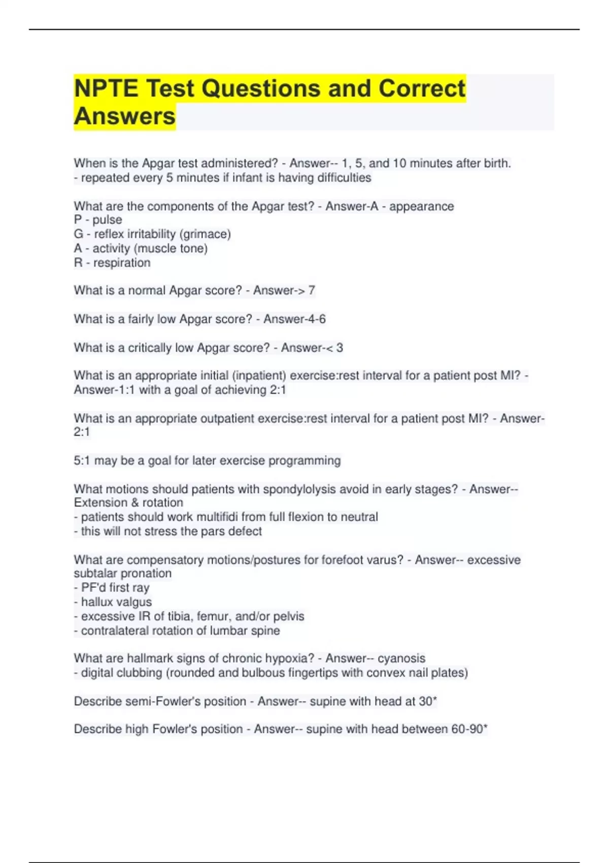 NPTE Test Questions and Correct Answers When is the Apgar test administered? - Answer-- 1, 5, and 10 minutes after birth. - repeated every 5 minutes if infant is having difficulties What are the components of the Apgar test? - Answer-A - appearance P - pulse G - reflex irritability (grimace) A - activity (muscle tone) R - respiration What is a normal Apgar score? - Answer-> 7 What is a fairly low Apgar score? - Answer-4-6 What is a critically low Apgar score? - Answer-< 3 What is an appropriate initial (inpatient) exercise:rest interval for a patient post MI? - Answer-1:1 with a goal of achieving 2:1 What is an appropriate outpatient exercise:rest interval for a patient post MI? - Answer2:1 5:1 may be a goal for later exercise programming What motions should patients with spondylolysis avoid in early stages? - Answer-- Extension & rotation - patients should work multifidi from full flexion to neutral - this will not stress the pars defect What are compensatory motions/postures for forefoot varus? - Answer-- excessive subtalar pronation - PF'd first ray - hallux valgus - excessive IR of tibia, femur, and/or pelvis - contralateral rotation of lumbar spine What are hallmark signs of chronic hypoxia? - Answer-- cyanosis - digital clubbing (rounded and bulbous fingertips with convex nail plates) Describe semi-Fowler's position - Answer-- supine with head at 30* Describe high Fowler's position - Answer-- supine with head between 60-90* Describe Trendelenbur position - Answer-- supine with feet higher than head by 15-30* What is the cardinal sign of Addison's disease? - Answer-Asthenia - muscle weakness that is progressive and debilitating Describe nursemaid's elbow. - Answer-- inferior subluxation of radial head from annular ligament What is the MOI for babysitter's elbow? - Answer-- forceful longitudinal pull of forearm in child Describe clinical manifestations of cystic fibrosis. - Answer-- inability to gain weight despite excessive appetite and adequate caloric intake - progressive loss of pulmonary function from progressive obstructive lung disease What body system(s) does cystic fibrosis involve? - Answer-Almost all - respiratory: thick, excessive abnormal mucus and ciliary function - GI: pancreatic enzyme deficiency - integumentary: increased secretion of highly ionized sweat - may develop significant COPD