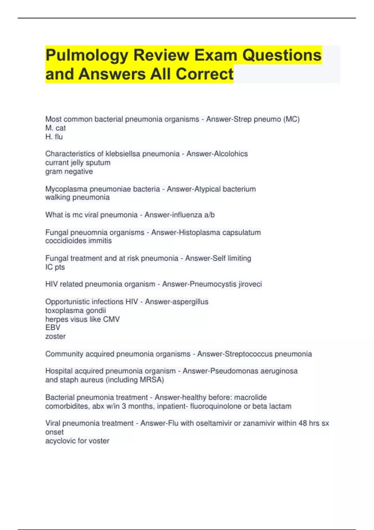 Pulmology Review Exam Questions and Answers All Correct Most common bacterial pneumonia organisms - Answer-Strep pneumo (MC) M. cat H. flu Characteristics of klebsiellsa pneumonia - Answer-Alcolohics currant jelly sputum gram negative Mycoplasma pneumoniae bacteria - Answer-Atypical bacterium walking pneumonia What is mc viral pneumonia - Answer-influenza a/b Fungal pneuomnia organisms - Answer-Histoplasma capsulatum coccidioides immitis Fungal treatment and at risk pneumonia - Answer-Self limiting IC pts HIV related pneumonia organism - Answer-Pneumocystis jiroveci Opportunistic infections HIV - Answer-aspergillus toxoplasma gondii herpes visus like CMV EBV zoster Community acquired pneumonia organisms - Answer-Streptococcus pneumonia Hospital acquired pneumonia organism - Answer-Pseudomonas aeruginosa and staph aureus (including MRSA) Bacterial pneumonia treatment - Answer-healthy before: macrolide comorbidites, abx w/in 3 months, inpatient- fluoroquinolone or beta lactam Viral pneumonia treatment - Answer-Flu with oseltamivir or zanamivir within 48 hrs sx onset acyclovic for voster symptomatic Fungal pneumo tx - Answer-anti-fungals Pertussis organism - Answer-Bordetella pertusis Three stages of pertussis - Answer-catarrhal, cold/runny nose paroxysmal, coughing spells leaving person breathless, whoop sound, vomiting convalescent- chronic cough gradually fades Abx given for pertussis? - Answer-yes due to it reducing the spread of the disease, treat with azithromycin or erythromycin TB organism - Answer-mycobacterium thberculosis how is tb spread and what two forms are there - Answer-respiratory droplets latent or active Treatment TB - Answer-Isoniazid Rifampin Pyrazinamide Ethambutol Asthma FEV1 and FEV1/FVC - Answer-forced vital capacity (FEV1/FVC <75%); <12% increase FEV1 after bronchodilatory therapy is supportive of diagnosis Step one asthma tx - Answer-SABA PRN Step 2 asthma tx - Answer-Low dose ICS Step 3 asthma tx - Answer-Los dose ICS + LABA OR medium dose ICS Step 4 asthma tx - Answer-Medium dose ICS plus LABA Step 5 asthma tx - Answer-High dose ICS + LABA AND consider omalizumab for pts with allergies Step 6 asthma tx - Answer-High dose ICS + LABA + oral steroids AND consider omalizumab Bronchitis main sx - Answer-chough with or without sputum for 1-3 weeks What should be avoided in kids less than 2 - Answer-OTC cough and cold products