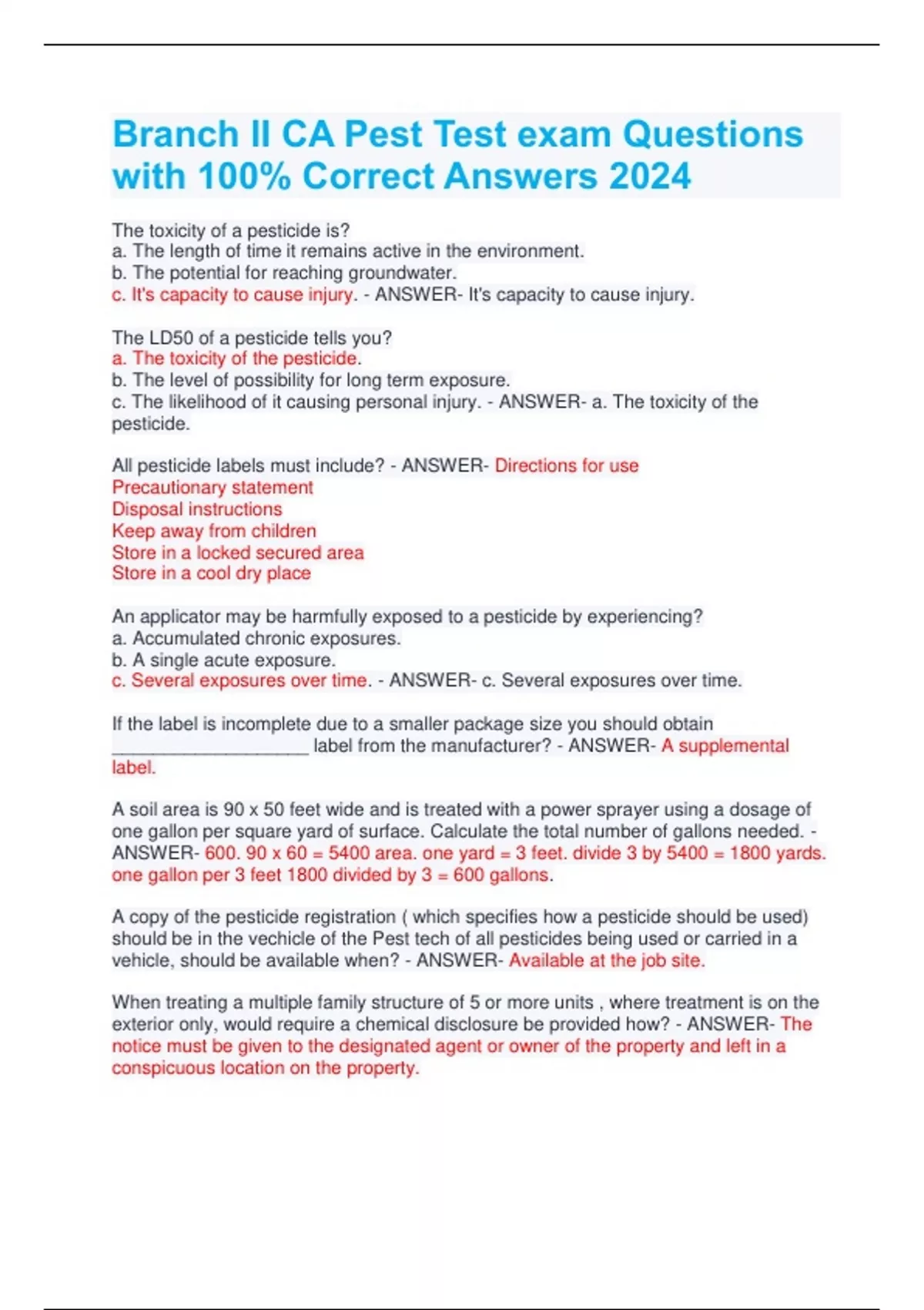 Branch II CA Pest Test exam Questions with 100% Correct Answers 2024 The toxicity of a pesticide is? a. The length of time it remains active in the environment. b. The potential for reaching groundwater. c. It's capacity to cause injury. - ANSWER- It's capacity to cause injury. The LD50 of a pesticide tells you? a. The toxicity of the pesticide. b. The level of possibility for long term exposure. c. The likelihood of it causing personal injury. - ANSWER- a. The toxicity of the pesticide. All pesticide labels must include? - ANSWER- Directions for use Precautionary statement Disposal instructions Keep away from children Store in a locked secured area Store in a cool dry place An applicator may be harmfully exposed to a pesticide by experiencing? a. Accumulated chronic exposures. b. A single acute exposure. c. Several exposures over time. - ANSWER- c. Several exposures over time. If the label is incomplete due to a smaller package size you should obtain ___________________ label from the manufacturer? - ANSWER- A supplemental label. A soil area is 90 x 50 feet wide and is treated with a power sprayer using a dosage of one gallon per square yard of surface. Calculate the total number of gallons needed. - ANSWER- 600. 90 x 60 = 5400 area. one yard = 3 feet. divide 3 by 5400 = 1800 yards. one gallon per 3 feet 1800 divided by 3 = 600 gallons. A copy of the pesticide registration ( which specifies how a pesticide should be used) should be in the vechicle of the Pest tech of all pesticides being used or carried in a vehicle, should be available when? - ANSWER- Available at the job site. When treating a multiple family structure of 5 or more units , where treatment is on the exterior only, would require a chemical disclosure be provided how? - ANSWER- The notice must be given to the designated agent or owner of the property and left in a conspicuous location on the property. The state of CA requires that a report for each pest control operation other than fumigation in which a pesticide is used , shall contain the following information? - ANSWER- Name of owner, his or her agent address of the property treated. Date of treatment, description of area treated, targeted pests, pesticide and amount used Identity of person applying pesticide The name address and phone number of a medical care facility must be posted in two places. Name them. - ANSWER- Posted in employers office and in the service vehicle. Increasing the pump pressure will increase the probability of ? - ANSWER- Drift A Getz duster is used to apply small amounts of ? - ANSWER- Dust insecticide into cracks and crevices.