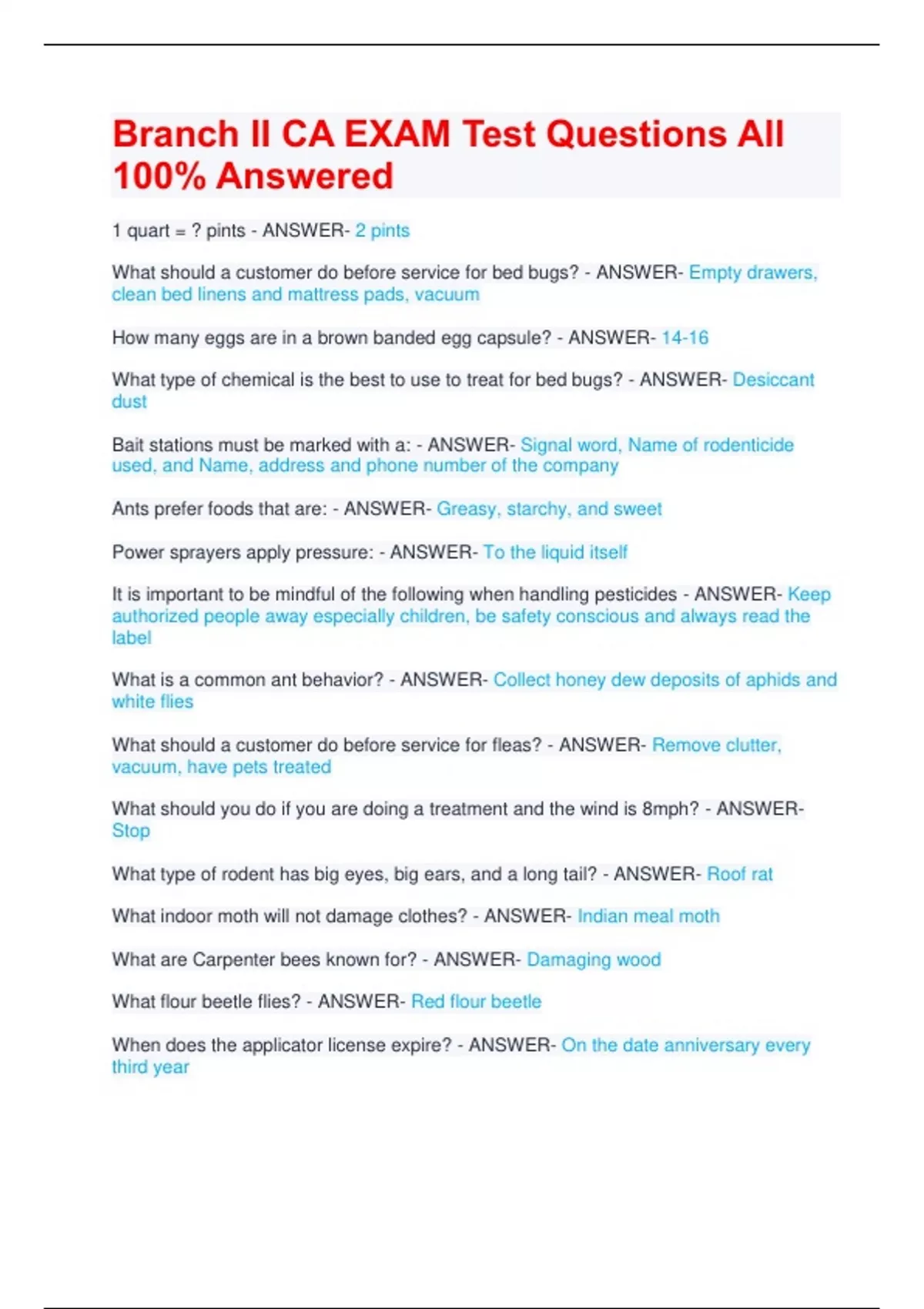 Branch II CA EXAM Test Questions All 100% Answered 1 quart = ? pints - ANSWER- 2 pints What should a customer do before service for bed bugs? - ANSWER- Empty drawers, clean bed linens and mattress pads, vacuum How many eggs are in a brown banded egg capsule? - ANSWER- 14-16 What type of chemical is the best to use to treat for bed bugs? - ANSWER- Desiccant dust Bait stations must be marked with a: - ANSWER- Signal word, Name of rodenticide used, and Name, address and phone number of the company Ants prefer foods that are: - ANSWER- Greasy, starchy, and sweet Power sprayers apply pressure: - ANSWER- To the liquid itself It is important to be mindful of the following when handling pesticides - ANSWER- Keep authorized people away especially children, be safety conscious and always read the label What is a common ant behavior? - ANSWER- Collect honey dew deposits of aphids and white flies What should a customer do before service for fleas? - ANSWER- Remove clutter, vacuum, have pets treated What should you do if you are doing a treatment and the wind is 8mph? - ANSWERStop What type of rodent has big eyes, big ears, and a long tail? - ANSWER- Roof rat What indoor moth will not damage clothes? - ANSWER- Indian meal moth What are Carpenter bees known for? - ANSWER- Damaging wood What flour beetle flies? - ANSWER- Red flour beetle When does the applicator license expire? - ANSWER- On the date anniversary every third year How far can a mouse jump? - ANSWER- 12 inches vertically What tick is known for spreading or giving Lyme disease? - ANSWER- Western black legged tick in western U.S. Who is to be notified of a pesticide spill? - ANSWER- County agriculture commissioner and local authorities What is the most important part of eradicating a store product pest? - ANSWERFinding and removing source
