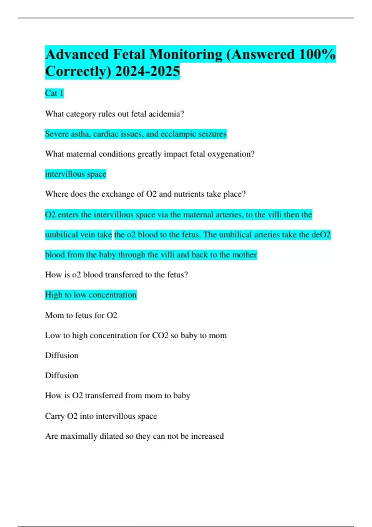 Advanced Fetal Monitoring (Answered 100% Correctly) Cat 1 What category rules out fetal acidemia? Severe astha, cardiac issues, and ecclampic seizures What maternal conditions greatly impact fetal oxygenation? intervillous space Where does the exchange of O2 and nutrients take place? O2 enters the intervillous space via the maternal arteries, to the villi then the umbilical vein take the o2 blood to the fetus. The umbilical arteries take the deO2 blood from the baby through the villi and back to the mother How is o2 blood transferred to the fetus? High to low concentration Mom to fetus for O2 Low to high concentration for CO2 so baby to mom Diffusion Diffusion How is O2 transferred from mom to baby Carry O2 into intervillous space Are maximally dilated so they can not be increased Explain spiral arteries in placenta Maternal conditions like pre-e and cardiac diseas