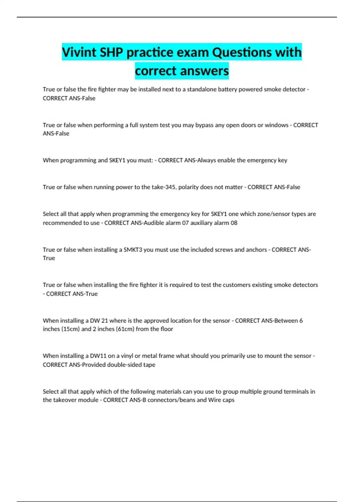 Vivint SHP practice exam Questions with correct answers True or false the fire fighter may be installed next to a standalone battery powered smoke detector - CORRECT ANS-False True or false when performing a full system test you may bypass any open doors or windows - CORRECT ANS-False When programming and SKEY1 you must: - CORRECT ANS-Always enable the emergency key True or false when running power to the take-345, polarity does not matter - CORRECT ANS-False Select all that apply when programming the emergency key for SKEY1 one which zone/sensor types are recommended to use - CORRECT ANS-Audible alarm 07 auxiliary alarm 08 True or false when installing a SMKT3 you must use the included screws and anchors - CORRECT ANS-True True or false when installing the fire fighter it is required to test the customers existing smoke detectors - CORRECT ANS-True When installing a DW 21 where is the approved location for the sensor - CORRECT ANS-Between 6 inches (15cm) and 2 inches (61cm) from the floor When installing a DW11 on a vinyl or metal frame what should you primarily use to mount the sensor - CORRECT ANS-Provided double-sided tape Select all that apply which of the following materials can you use to group multiple ground terminals in the takeover module - CORRECT ANS-B connectors/beans and Wire caps W