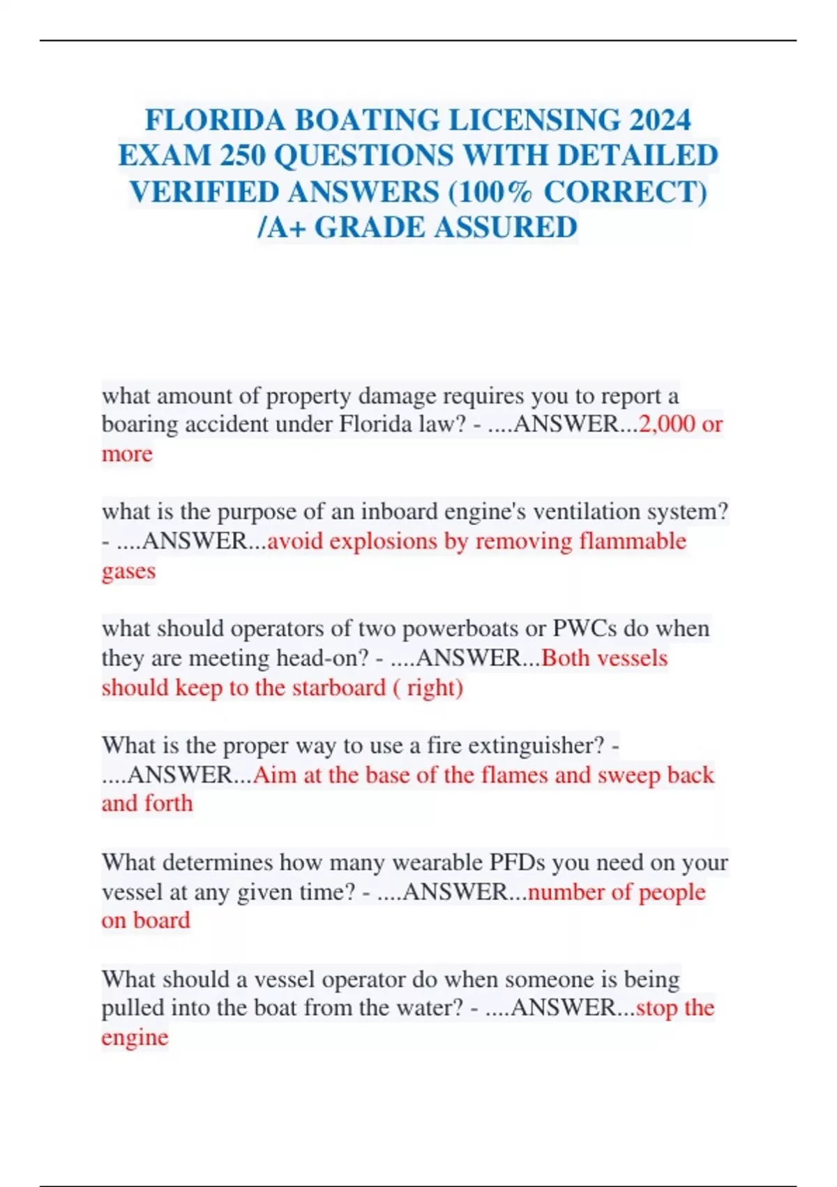 FLORIDA BOATING LICENSING 2024 EXAM 250 QUESTIONS WITH DETAILED VERIFIED ANSWERS (100% CORRECT) /A+ GRADE ASSURED