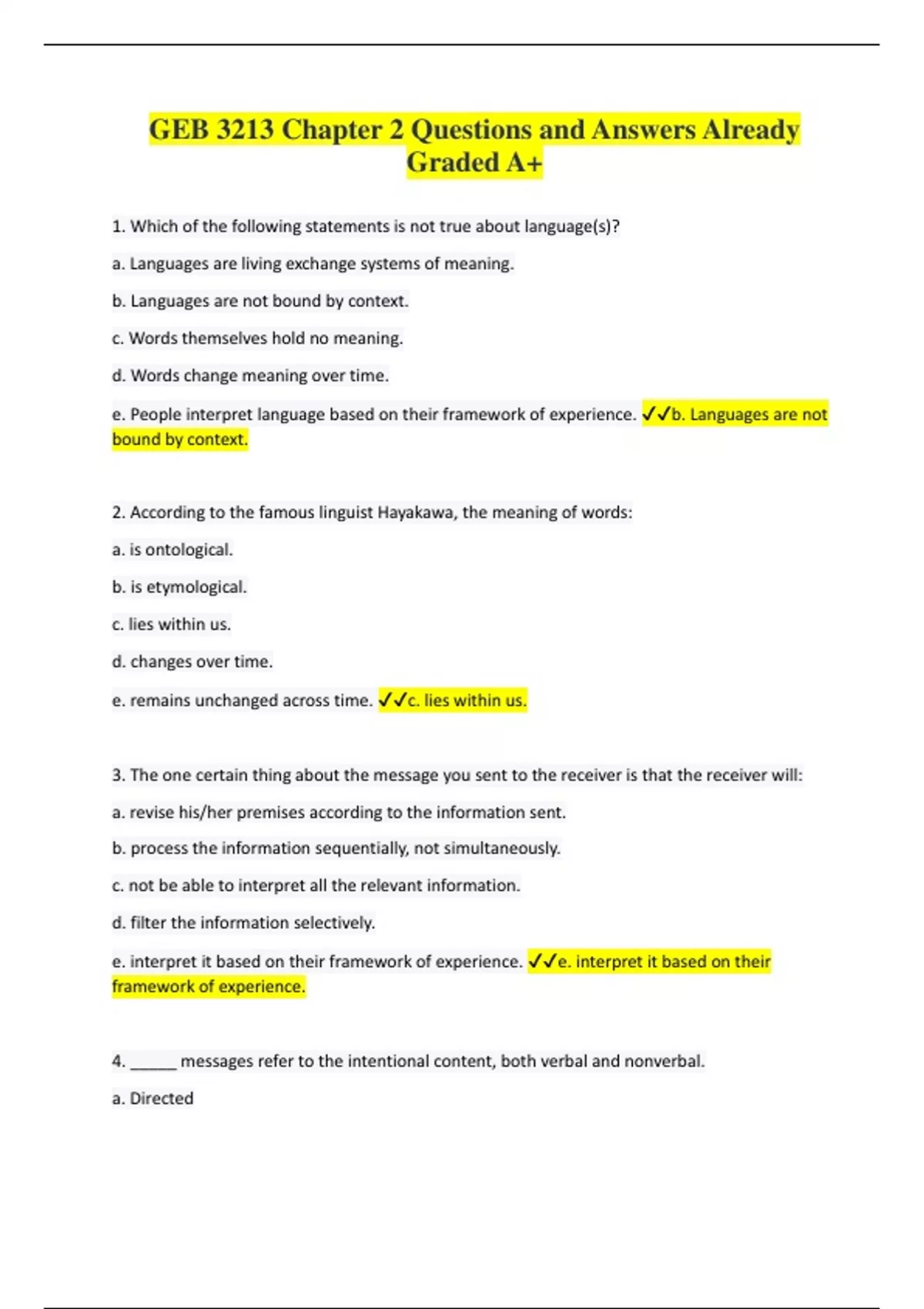 GEB 3213 Chapter 2 Questions and Answers Already Graded A+ 1. Which of the following statements is not true about language(s)? a. Languages are living exchange systems of meaning. b. Languages are not bound by context. c. Words themselves hold no meaning. d. Words change meaning over time. e. People interpret language based on their framework of experience. b. Languages are not bound by context. 2. According to the famous linguist Hayakawa, the meaning of words: a. is ontological. b. is etymological. c. lies within us. d. changes over time. e. remains unchanged across time. c. lies within us. 3. The one certain thing about the message you sent to the receiver is that the receiver will: a. revise his/her premises according to the information sent. b. process the information sequentially, not simultaneously. c. not be able to interpret all the relevant information. d. filter the information selectively. e. interpret it based on their framework of experience. e. interpret it based on their framework of experience