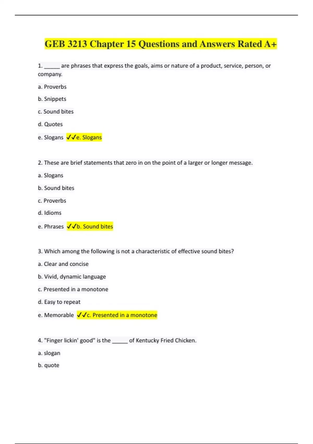GEB 3213 Chapter 15 Questions and Answers Rated A+ 1. _____ are phrases that express the goals, aims or nature of a product, service, person, or company. a. Proverbs b. Snippets c. Sound bites d. Quotes e. Slogans e. Slogans 2. These are brief statements that zero in on the point of a larger or longer message. a. Slogans b. Sound bites c. Proverbs d. Idioms e. Phrases b. Sound bites 3. Which among the following is not a characteristic of effective sound bites? a. Clear and concise b. Vivid, dynamic language c. Presented in a monotone d. Easy to repeat e. Memorable c. Presented in a monotone