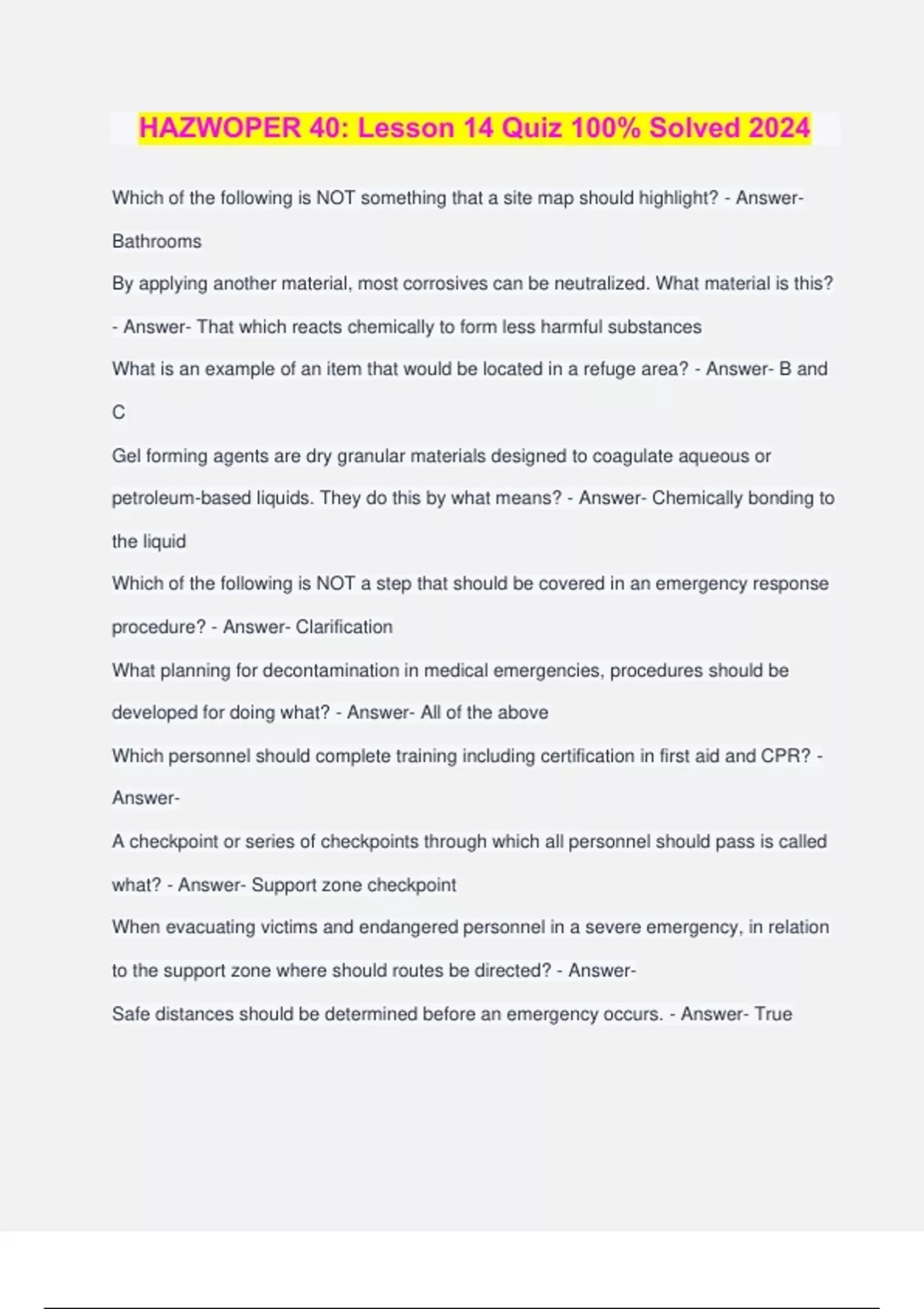 HAZWOPER 40: Lesson 14 Quiz 100% Solved 2024 Which of the following is NOT something that a site map should highlight? - Answer- Bathrooms By applying another material, most corrosives can be neutralized. What material is this? - Answer- That which reacts chemically to form less harmful substances What is an example of an item that would be located in a refuge area? - Answer- B and C Gel forming agents are dry granular materials designed to coagulate aqueous or petroleum-based liquids. They do this by what means? - Answer- Chemically bonding to the liquid Which of the following is NOT a step that should be covered in an emergency response procedure? - Answer- Clarification