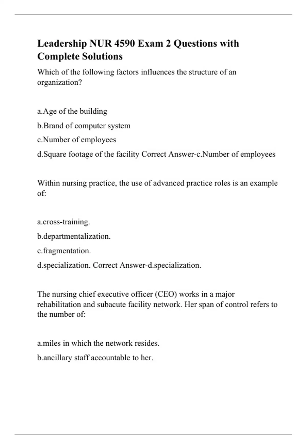 Leadership NUR 4590 Exam 2 Questions with Complete Solutions
