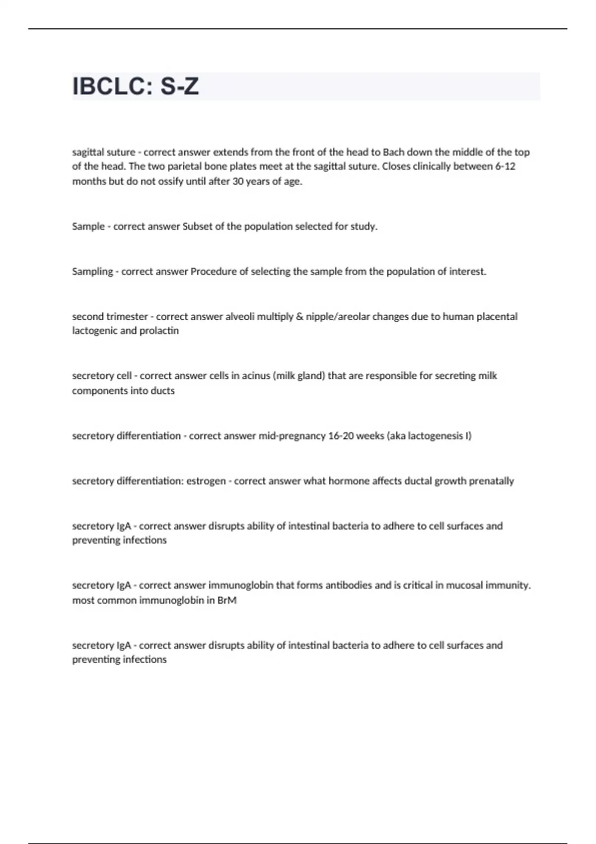 IBCLC: S-Zsagittal suture - correct answer extends from the front of the head to Bach down the middle of the top of the head. The two parietal bone plates meet at the sagittal suture. Closes clinically between 6-12 months but do not ossify until after 30 years of age. Sample - correct answer Subset of the population selected for study. Sampling - correct answer Procedure of selecting the sample from the population of interest. second trimester - correct answer alveoli multiply & nipple/areolar changes due to human placental lactogenic and prolactin secretory cell - correct answer cells in acinus (milk gland) that are responsible for secreting milk components into ducts secretory differentiation - correct answer mid-pregnancy 16-20 weeks (aka lactogenesis I) secretory differentiation: estrogen - correct answer what hormone affects ductal growth prenatally secretory IgA - correct answer disrupts ability of intestinal bacteria to adhere to cell surfaces and preventing infections secretory IgA - correct answer immunoglobin that forms antibodies and is critical in mucosal immunity. most common immunoglobin in BrM secretory IgA - correct answer disrupts ability of intestinal bacteria to adhere to cell surfaces and preventing infections