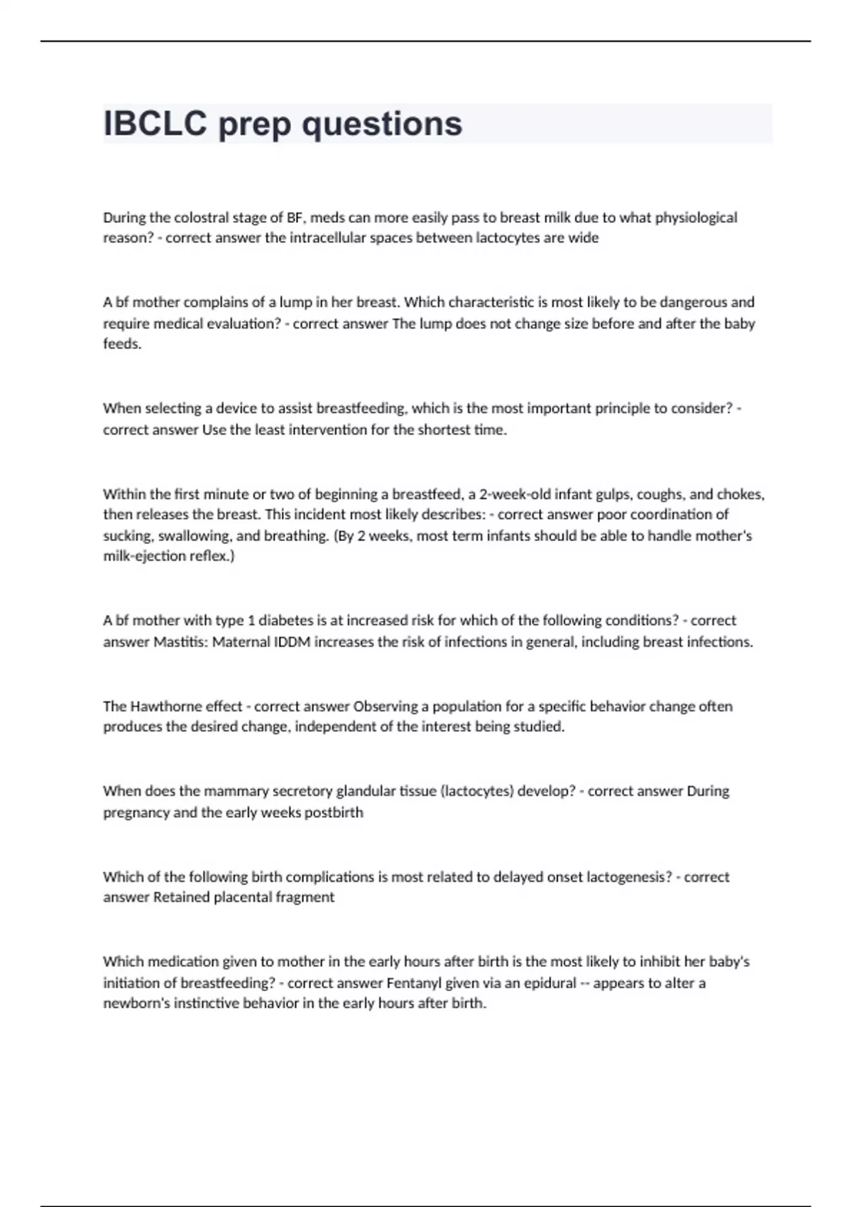 IBCLC prep questionsDuring the colostral stage of BF, meds can more easily pass to breast milk due to what physiological reason? - correct answer the intracellular spaces between lactocytes are wide A bf mother complains of a lump in her breast. Which characteristic is most likely to be dangerous and require medical evaluation? - correct answer The lump does not change size before and after the baby feeds. When selecting a device to assist breastfeeding, which is the most important principle to consider? - correct answer Use the least intervention for the shortest time. Within the first minute or two of beginning a breastfeed, a 2-week-old infant gulps, coughs, and chokes, then releases the breast. This incident most likely describes: - correct answer poor coordination of sucking, swallowing, and breathing. (By 2 weeks, most term infants should be able to handle mother's milk-ejection reflex.) A bf mother with type 1 diabetes is at increased risk for which of the following conditions? - correct answer Mastitis: Maternal IDDM increases the risk of infections in general, including breast infections. The Hawthorne effect - correct answer Observing a population for a specific behavior change often produces the desired change, independent of the interest being studied. When does the mammary secretory glandular tissue (lactocytes) develop? - correct answer During pregnancy and the early weeks postbirth Which of the following birth complications is most related to delayed onset lactogenesis? - correct answer Retained placental fragment Which medication given to mother in the early hours after birth is the most likely to inhibit her baby's initiation of breastfeeding? - correct answer Fentanyl given via an epidural -- appears to alter a newborn's instinctive behavior in the early hours after birth.