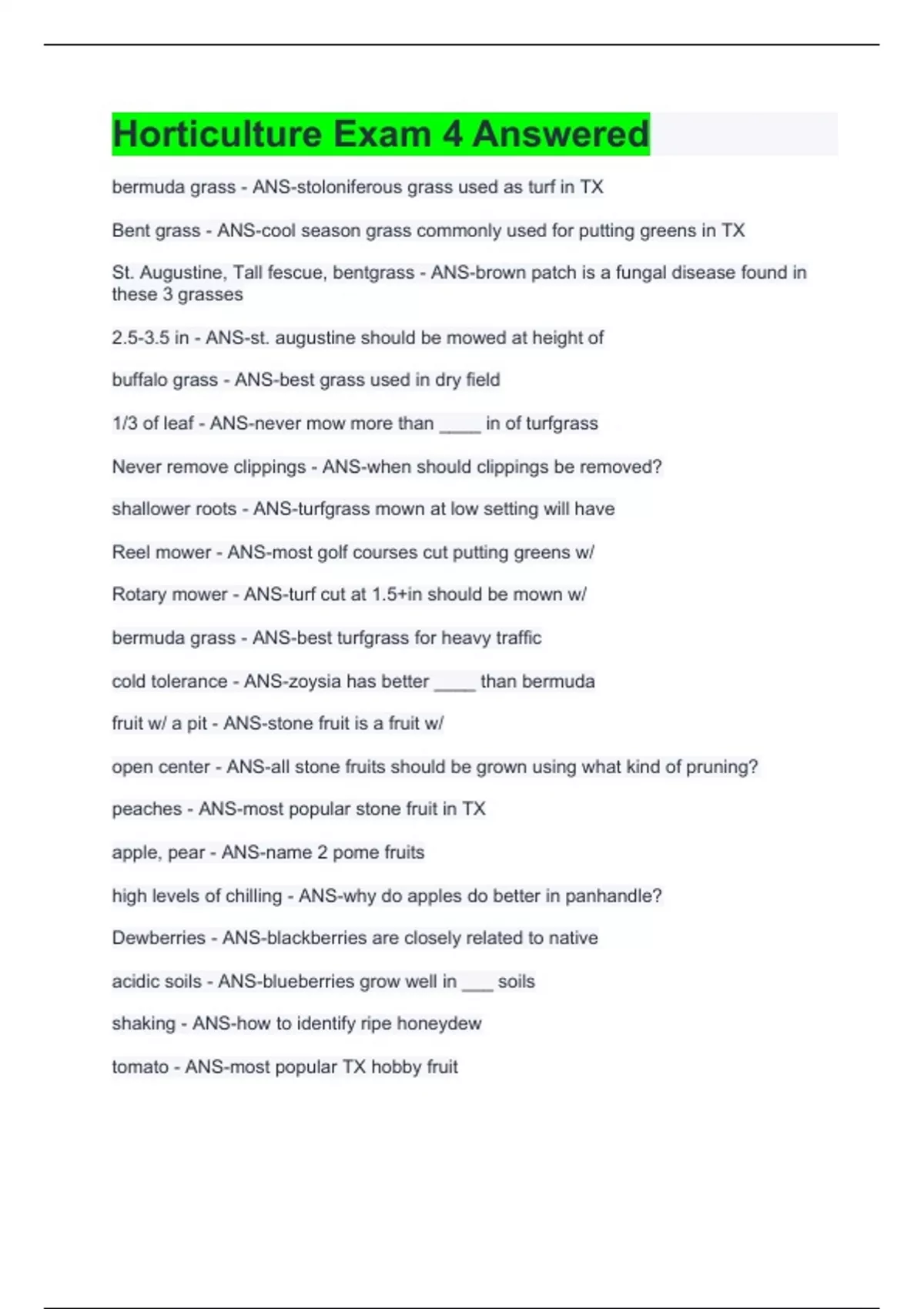 Horticulture Exam 4 Answered