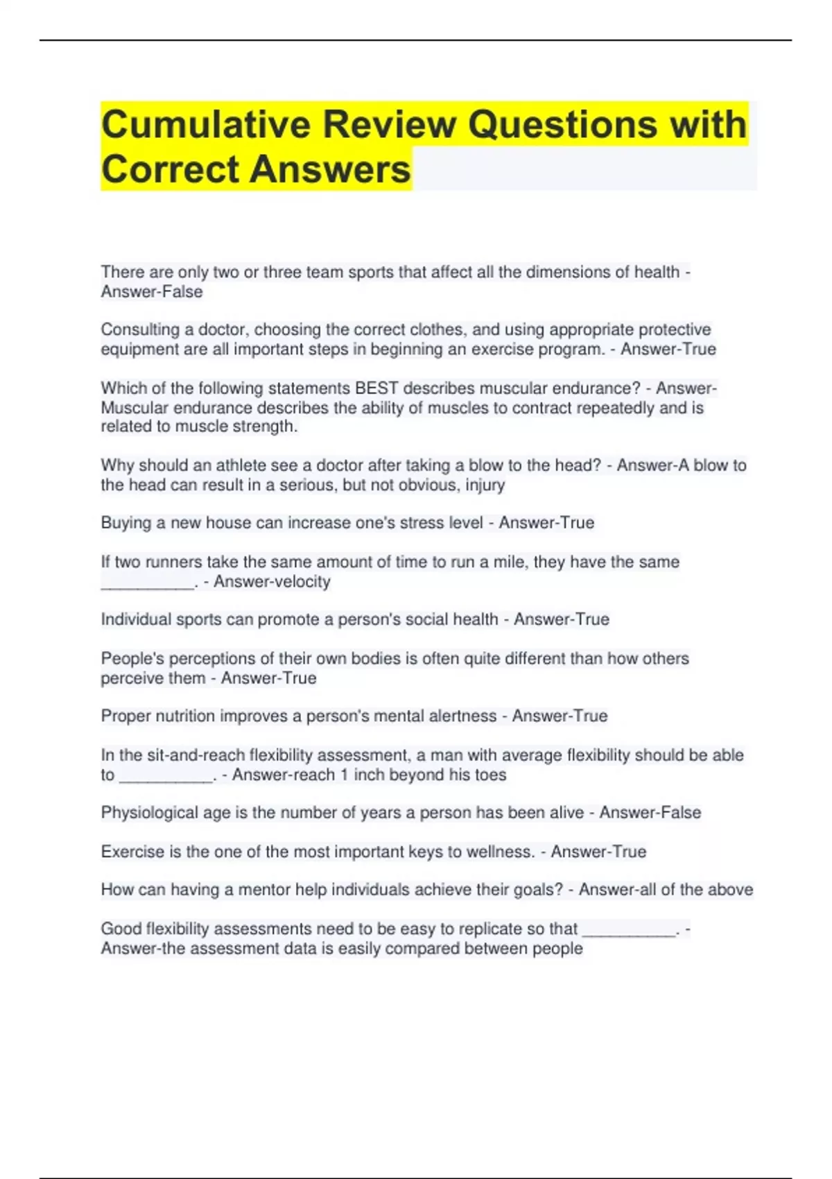 Cumulative Review Questions with Correct Answers There are only two or three team sports that affect all the dimensions of health - Answer-False Consulting a doctor, choosing the correct clothes, and using appropriate protective equipment are all important steps in beginning an exercise program. - Answer-True Which of the following statements BEST describes muscular endurance? - AnswerMuscular endurance describes the ability of muscles to contract repeatedly and is related to muscle strength. Why should an athlete see a doctor after taking a blow to the head? - Answer-A blow to the head can result in a serious, but not obvious, injury Buying a new house can increase one's stress level - Answer-True If two runners take the same amount of time to run a mile, they have the same __________. - Answer-velocity