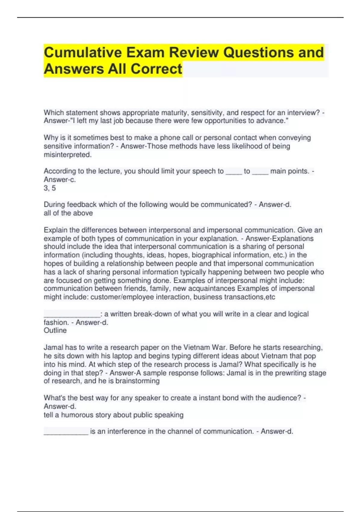 Cumulative Exam Review Questions and Answers All Correct Which statement shows appropriate maturity, sensitivity, and respect for an interview? - Answer-"I left my last job because there were few opportunities to advance." Why is it sometimes best to make a phone call or personal contact when conveying sensitive information? - Answer-Those methods have less likelihood of being misinterpreted. According to the lecture, you should limit your speech to ____ to ____ main points. - Answer-c. 3, 5 During feedback which of the following would be communicated? - Answer-d. all of the above Explain the differences between interpersonal and impersonal communication. Give an example of both types of communication in your explanation. - Answer-Explanations should include the idea that interpersonal communication is a sharing of personal information (including thoughts, ideas, hopes, biographical information, etc.) in the hopes of building a relationship between people and that impersonal communication has a lack of sharing personal information typically happening between two people who are focused on getting something done. Examples of interpersonal might include: communication between friends, family, new acquaintances Examples of impersonal might include: customer/employee interaction, business transactions,etc ______________: a written break-down of what you will write in a clear and logical fashion. - Answer-d. Outline Jamal has to write a research paper on the Vietnam War. Before he starts researching, he sits down with his laptop and begins typing different ideas about Vietnam that pop into his mind. At which step of the research process is Jamal? What specifically is he doing in that step? - Answer-A sample response follows: Jamal is in the prewriting stage of research, and he is brainstorming What's the best way for any speaker to create a instant bond with the audience? - Answer-d. tell a humorous story about public speaking