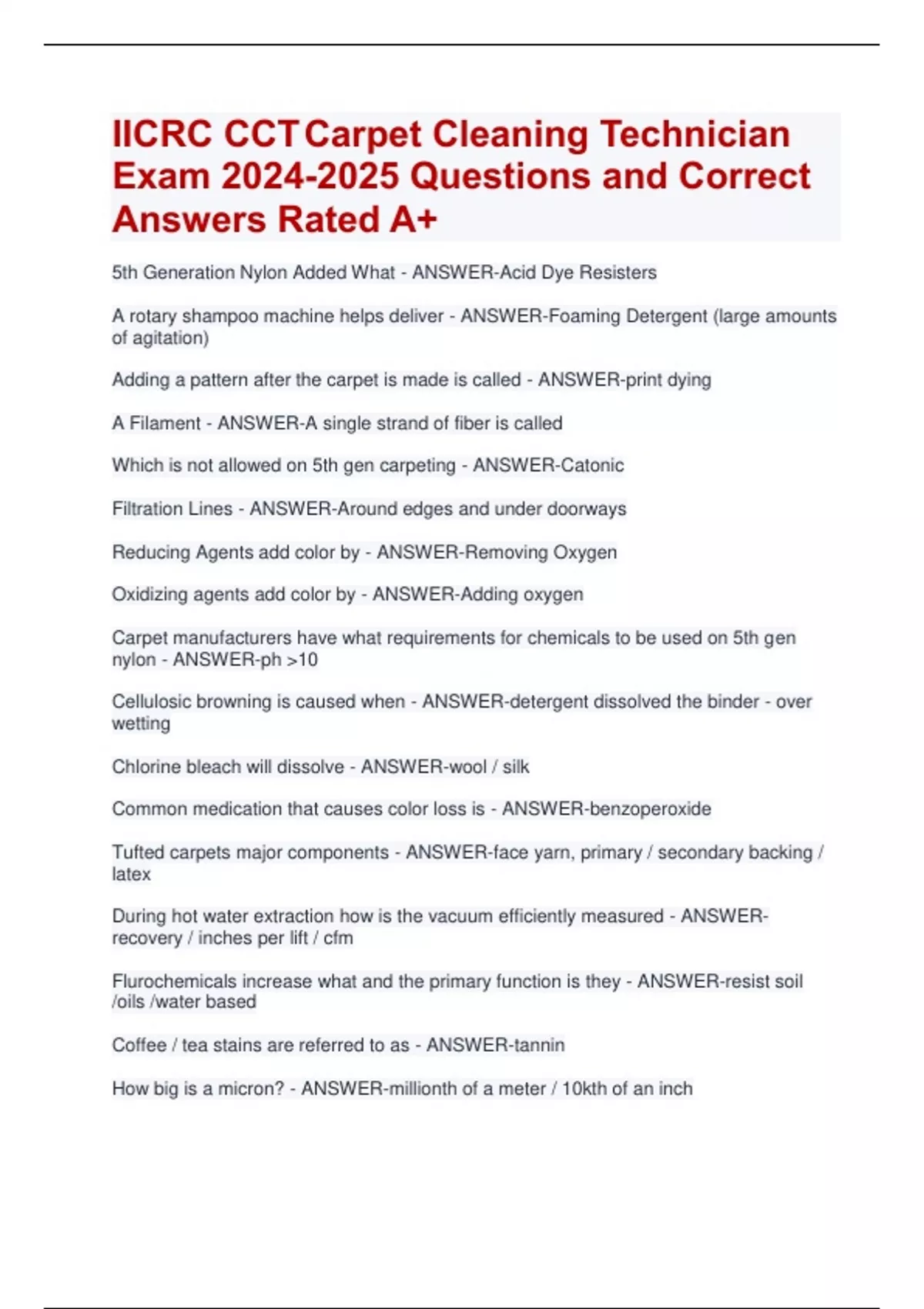 IICRC CCTCarpet Cleaning Technician Exam Questions and Correct Answers Rated A+