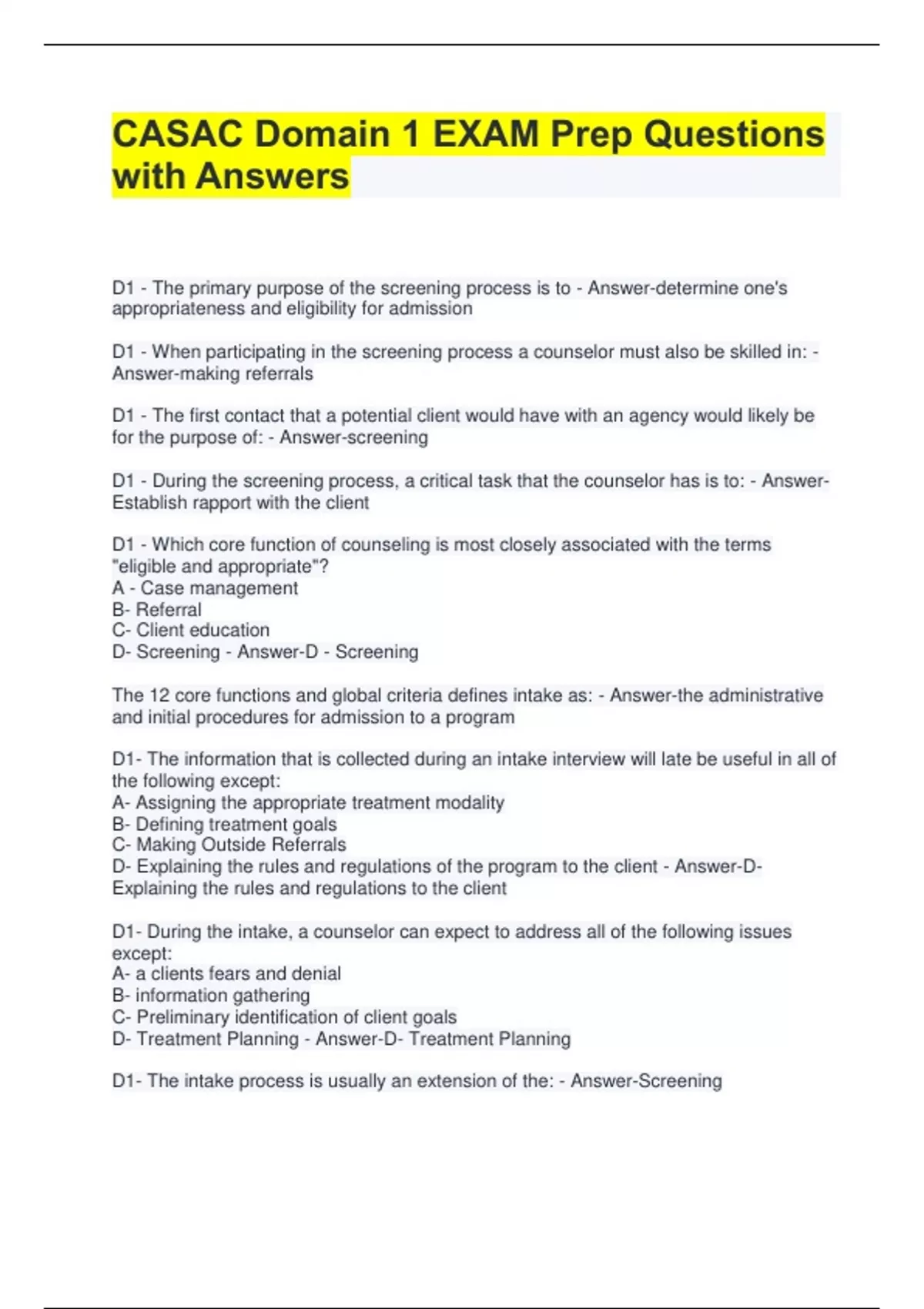 CASAC Domain 1 EXAM Prep Questions with Answers D1 - The primary purpose of the screening process is to - Answer-determine one's appropriateness and eligibility for admission D1 - When participating in the screening process a counselor must also be skilled in: - Answer-making referrals D1 - The first contact that a potential client would have with an agency would likely be for the purpose of: - Answer-screening D1 - During the screening process, a critical task that the counselor has is to: - AnswerEstablish rapport with the client D1 - Which core function of counseling is most closely associated with the terms "eligible and appropriate"? A - Case management B- Referral C- Client education D- Screening - Answer-D - Screening The 12 core functions and global criteria defines intake as: - Answer-the administrative and initial procedures for admission to a program D1- The information that is collected during an intake interview will late be useful in all of the following except: A- Assigning the appropriate treatment modality B- Defining treatment goals C- Making Outside Referrals D- Explaining the rules and regulations of the program to the client - Answer-DExplaining the rules and regulations to the client D1- During the intake, a counselor can expect to address all of the following issues except: A- a clients fears and denial B- information gathering C- Preliminary identification of client goals D- Treatment Planning - Answer-D- Treatment Planning D1- The intake process is usually an extension of the: - Answer-Screening D1- the intake process involves: - Answer-Completing of the required documentation for admission to the program D1- Obtaining appropriately and fully executed releases of information, financial, and consent for treatment, happens during the client's - Answer-intake D1- Before therapy of counseling begins, clients may be given information about the treatment they will receive, as well as possible risks involved. This process is known as: - Answer-Obtaining informed consent to treatment D1- a 42 year old male has just completed intake admission forms and is considered appropriate and eligible for treatment. Which step should occur next? A- a licensed physician should preform a physical examination on the client B- the client should complete psychological tests to be used in the evaluation C- the counselor should conduct an initial family therapy session in order to address problems caused by the clients use D- the counselor should provide the client with an overview describing the goal, objectives, rules, and obligations of the program - Answer-D - the counselor should provide the client with an overview describing the goal, objectives, rules, and obligations of the program D1- The orientation process provides a client with an overview of - Answer-Their client rights and obligations as participants in the treatment program D1- If the orientation process is neglected or incomplete a client may - Answer-have incorrect information and unanswered questions about the program the orientation process includes - Answer-providing the client with the information about the nature and goals of the treatment program