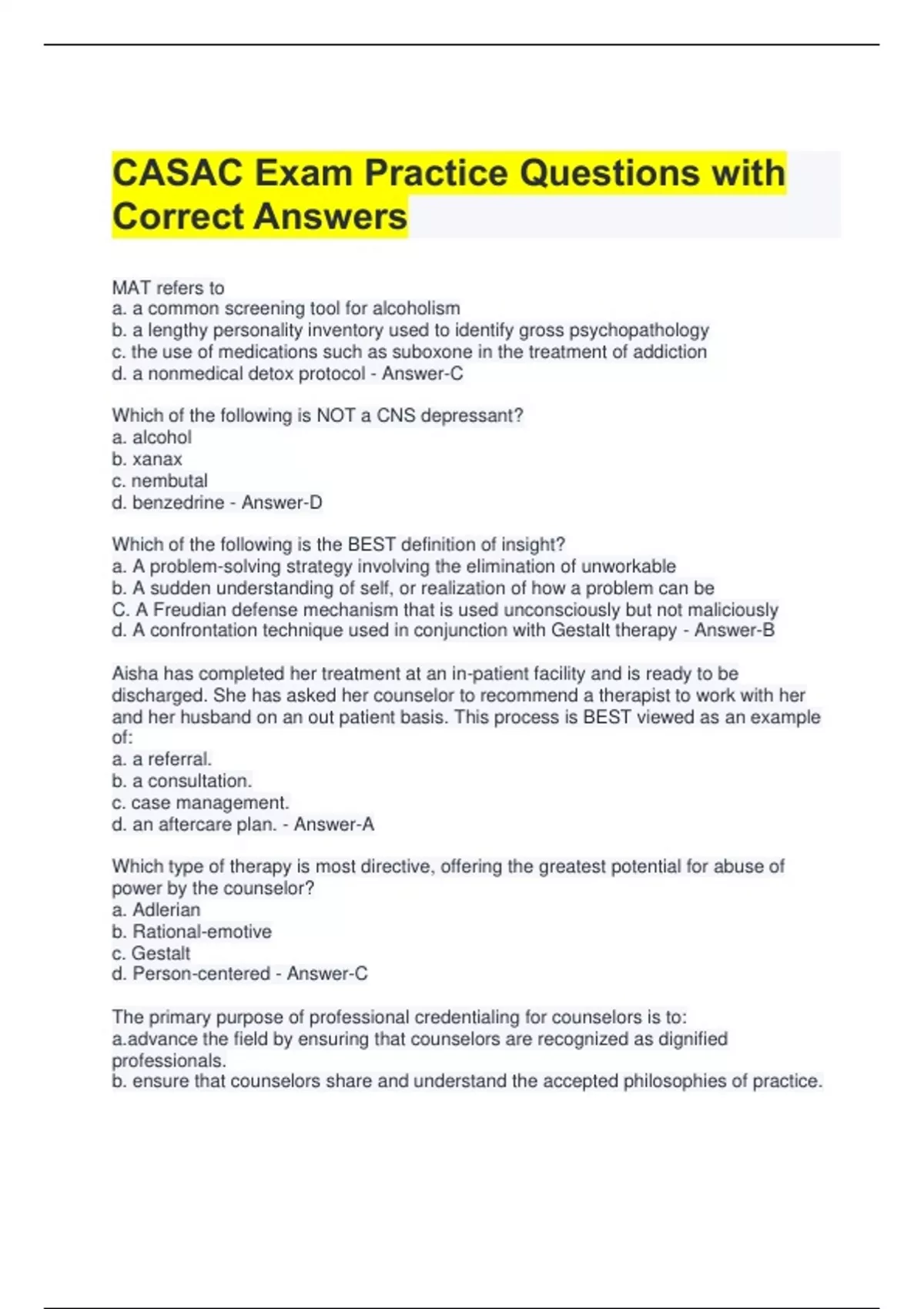 CASAC Exam Practice Questions with Correct Answers MAT refers to a. a common screening tool for alcoholism b. a lengthy personality inventory used to identify gross psychopathology c. the use of medications such as suboxone in the treatment of addiction d. a nonmedical detox protocol - Answer-C Which of the following is NOT a CNS depressant? a. alcohol b. xanax c. nembutal d. benzedrine - Answer-D Which of the following is the BEST definition of insight? a. A problem-solving strategy involving the elimination of unworkable b. A sudden understanding of self, or realization of how a problem can be C. A Freudian defense mechanism that is used unconsciously but not maliciously d. A confrontation technique used in conjunction with Gestalt therapy - Answer-B Aisha has completed her treatment at an in-patient facility and is ready to be discharged. She has asked her counselor to recommend a therapist to work with her and her husband on an out patient basis. This process is BEST viewed as an example of: a. a referral. b. a consultation. c. case management. d. an aftercare plan. - Answer-A Which type of therapy is most directive, offering the greatest potential for abuse of power by the counselor? a. Adlerian b. Rational-emotive c. Gestalt d. Person-centered - Answer-C The primary purpose of professional credentialing for counselors is to: ce the field by ensuring that counselors are recognized as dignified professionals. b. ensure that counselors share and understand the accepted philosophies of practice. c. protect public safety by ensuring that counselors meet minimum standards of competency. d. ensure that counselors receiving third-party payments have professional credentials. - Answer-C The concept of informed consent requires that before agreeing to accept treatment, clients should know their rights and obligations, therapeutic goals, fees for services and ________ a. availability of referral services b. community resources to be used c. with whom they will be participating in group activities d. the limits of their confidentiality - Answer-D